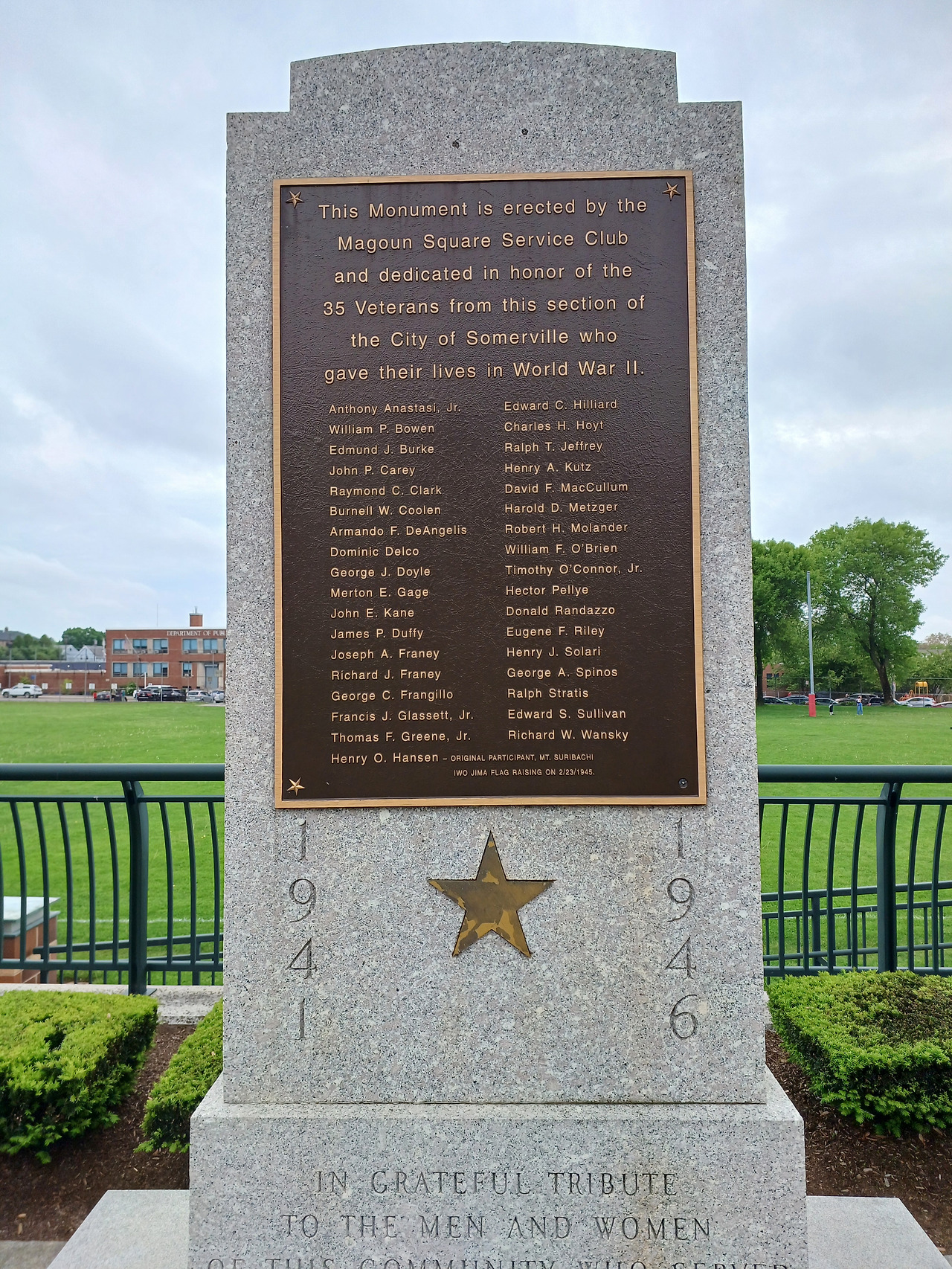 어제 지역 페스티벌로 가는 길에 발견한 이 기념비(오른쪽)는 미군스퀘어서비스클럽이 건립했으며, 제2차 세계대전 때 참전한 소머빌 지역출신 35명을 기리기 위해 건립한 것이다.