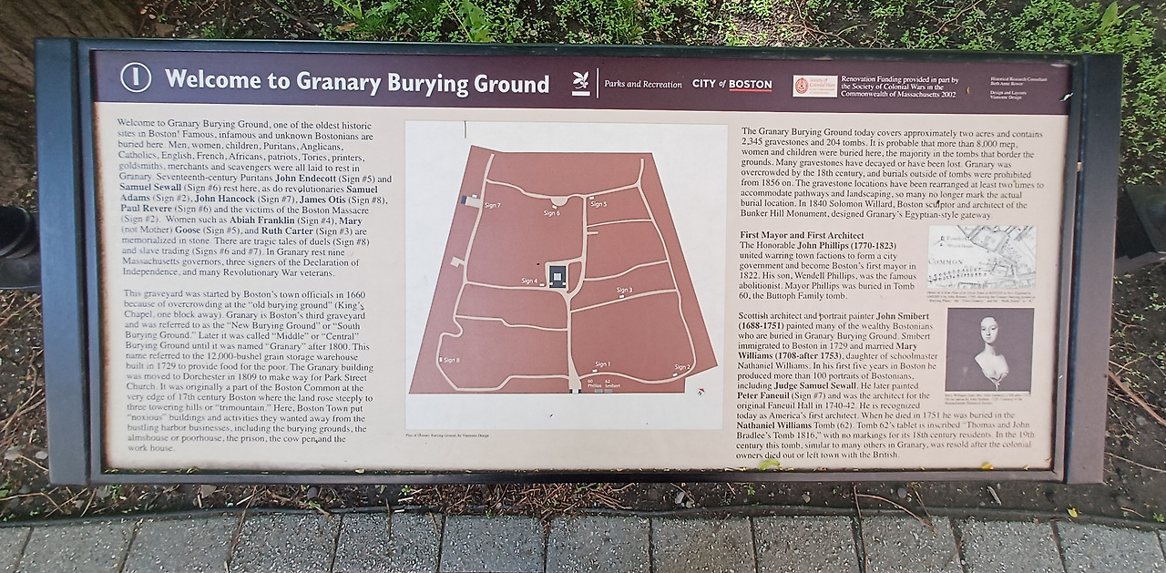 '그래너리 묘지는 유명인, 악명 높은 사람 그리고 무명인들이 묻혀있는 곳으로 204개의 무덤과 2345기의 묘비가 있고, 8천여 명이 넘는 여성과 어린이가 묻혔을 것으로 추정되지만 많은 묘비가 부식되거나 유실되었다. 1660년 옛 묘지군(한 블록 떨어진 곳에 위치한 킹스 채플)의 과밀화로 인해 조성되었고 보스턴의 세 번째 묘지로 남쪽 묘지라고도 불리었다. 그래너리로 이름을 바꾼 것은 가난한 이를 위한 곡물창고의 이름을 따온 것이다.'