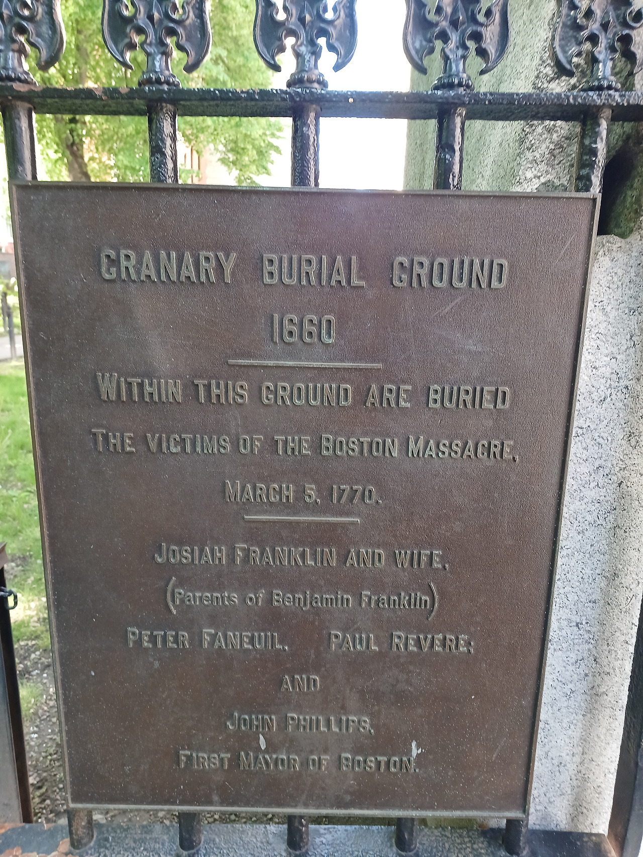 Massachusetts State House를 구경하고 다음으로 간 곳은 바로 Granary Burying Ground였다. 한마디로 말하자면 공동묘지였다. 공동묘지가 관광지로 된다는 것은 우리 정서상 안 맞지만 관람을 다하고 보니 국립현충원 같은 느낌이었다. 유명인사의 무덤이 한 곳에 있고, 특히 국가를 위하여 큰 일을 한 사람들과 미국 독립운동사에 큰 획을 그은 분들의 무덤을 모아 놓은 곳이었다. 안내판에는 악인의 무덤도 있다고 하지만 문외한인 나는 못 찾았다.