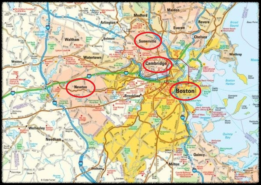 솔직히 보스턴에 오기 전까지만 해도 모든 지역의 이름이 생소하였다. 그 유명한 하버드나 MIT도 다 보스턴에 있는 줄 알았다. 그러나 하버드나 MIT는 캠브리지에 자리잡고 있었고, 한국 보스턴 영사관은 뉴튼에 있었고, 아들 집은 서머빌에 있었다.