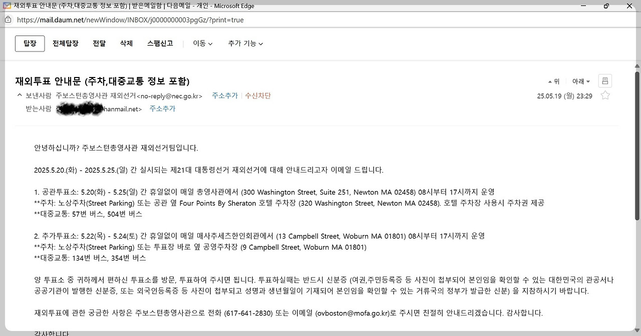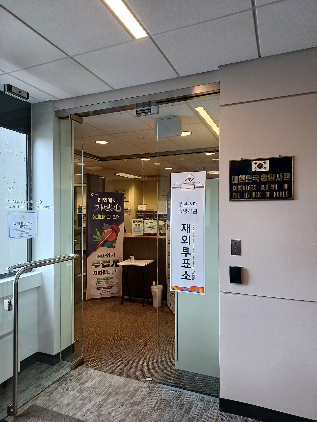 '제21대 대통령 재외선거'는 5월 20일~25일까지 엿새간 진행되었지만,주중에는 바쁜 아들의 상황을 고려하여 출근을 하지 않는 토요일에 같이 가기고 이미 약속을 하였다. 투표 장소는 ‘보스턴 영사관’과 ‘보스턴 한인회관’ 두 곳에서 진행되고 있었고 아들은 둘 다 집에서 그리 멀지 않는 곳이라고 했다.