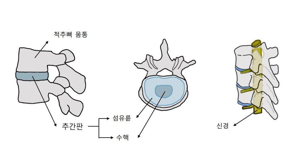 추간판(disc)이란 척추뼈 사이에 존재하는 연골조직으로 척추뼈끼리 충격을 흡수하고 유연하게 움직이도록 돕는 일종의 쿠션 역할을 하는 물방석이다.