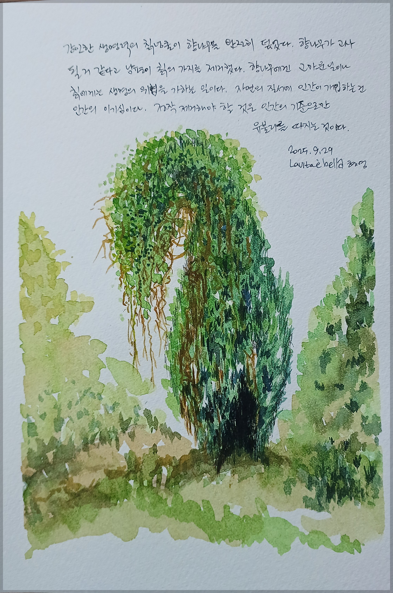 약자인 향나무에 감정 이입된 나는 "저기도 있어, 저기야." 라며 어둠 속에 숨은 칡넝쿨을 고발하는 충실한 제보자 역할을 하였다.