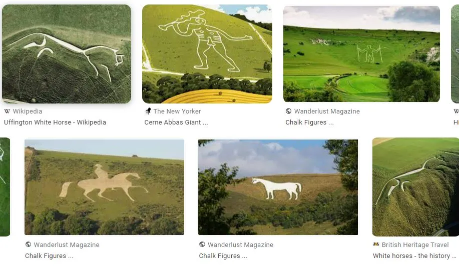 다양한 분필그림들 단순 구글링한 결과에 따르면, 영국에는 공식적으로 16개의 거대한 분필 말 그림이 있다고 한다. 원조는 어핑턴의 백마였겠지만, 비교적 최근까지 - 21세기가 되어서도 - 벌판에 분필로 지상화를 그리는 것은 계속되고 있는 것 같다. 마치 한국의 지자체들 이상한 조형물을 세워대는 이유랑 비슷한 것일까? 한국은 산이 많아 생산성을 포기하고 저런 짓을 할 수 없었을 것이다. 영국은 남는 게 평지다 보니, 땅에다 분필을 뿌려 그림을 그리겠다는 포부를 갖게 하는 것 같다.