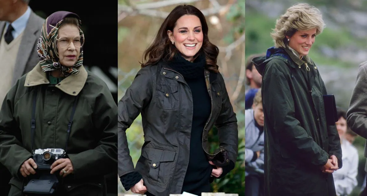 Barbour jacket porn으로 명명된 넷플릭스의 "The crown"의 일부장면과 실제 왕족들의 바버자켓 착용사례.