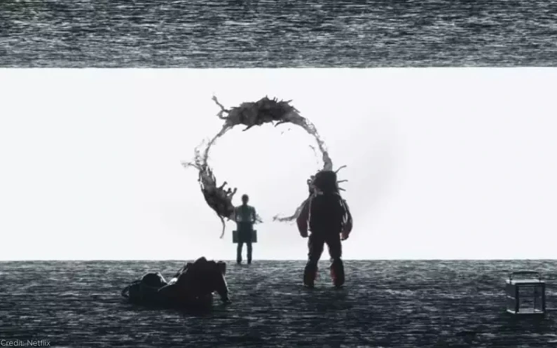 영화 "Arrival"의 한 장면. 어느 날 갑자기 나타난 외계인들의 언어는 시각적으로 원형의 이미지인데,