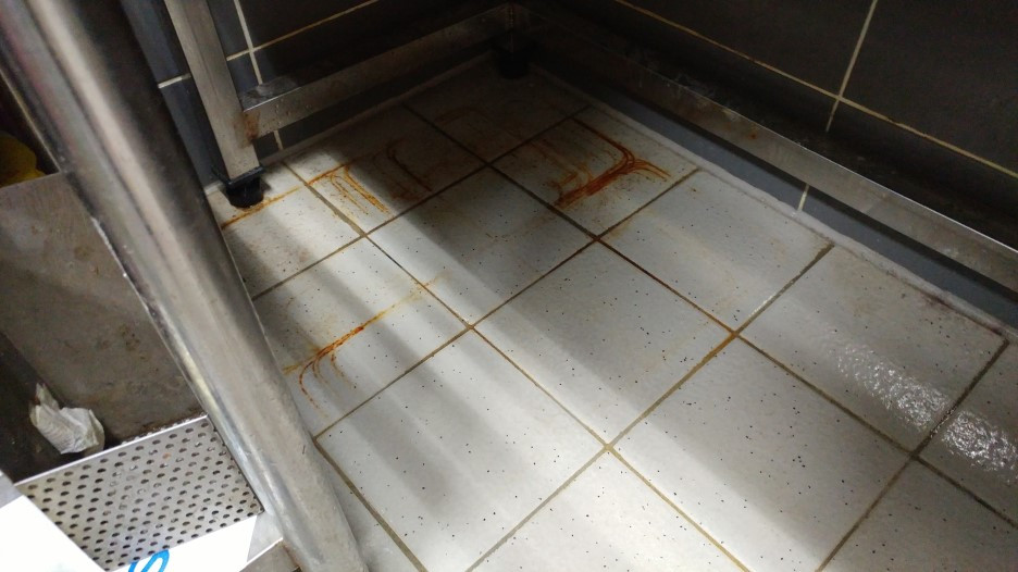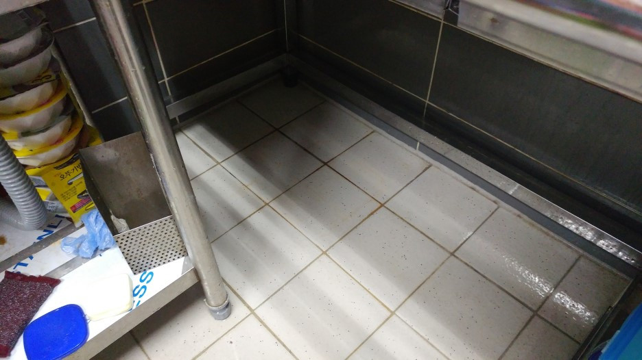 음식을 내어가는 상황이 아니라도 화구 밑 공간이 기름통의 녹으로 이렇게 지저분해져서 닦아 내려고 하면 몸을 최대한 쪼그려서 화구 밑으로 들어가야 이 녹들을 닦아낼 수 있습니다. 한가한 시간이라 위에서는 가스불이 켜진 상태는 아니라고는 하지만 단순히 머리를 찧을 수 있다는 것만으로도 충분히 위험한 공간이죠.
