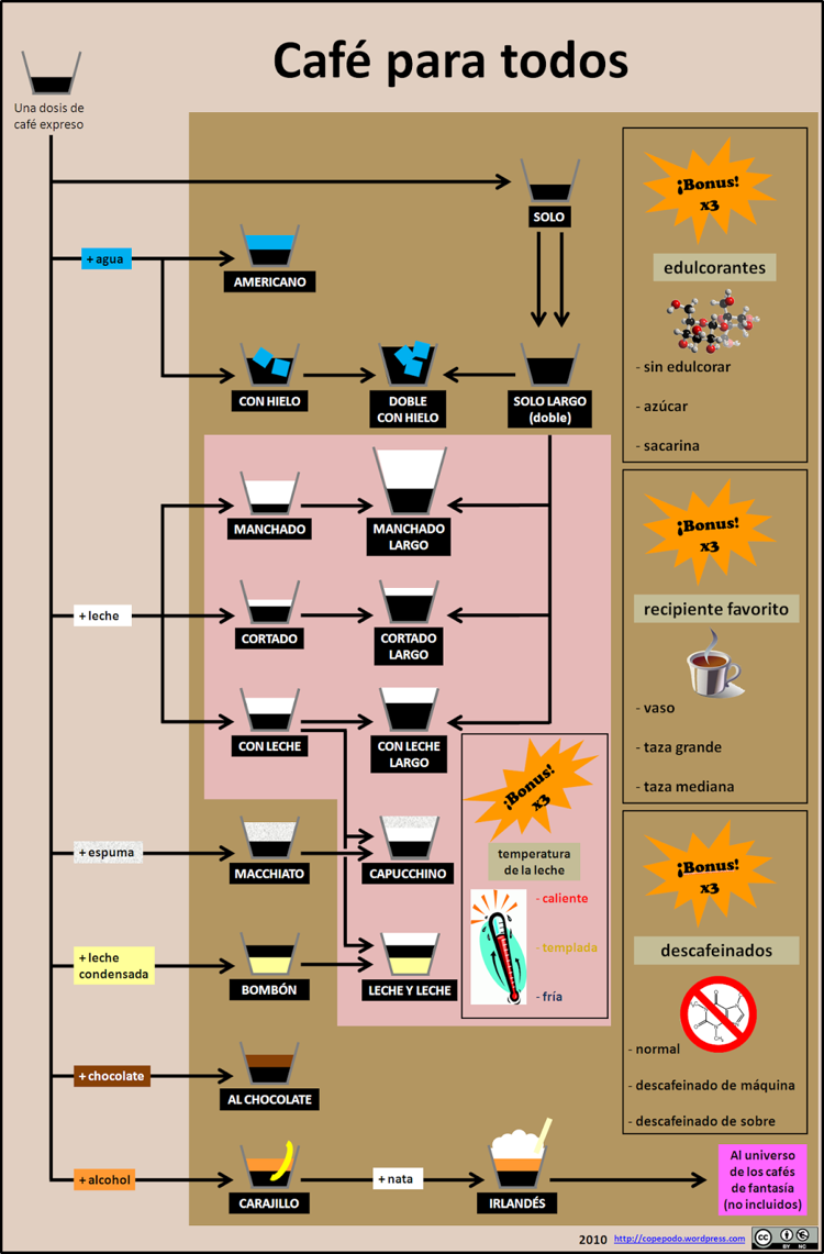 디카페인 커피이다. 단, de sobre 혹은 de máquina이다. sobre는 인스턴트 커피, máquina는 기계에서 뽑은 커피이다. 우유와 함께 마시고 싶다면 잊지 말고 con leche라고 이야기해야 한다.