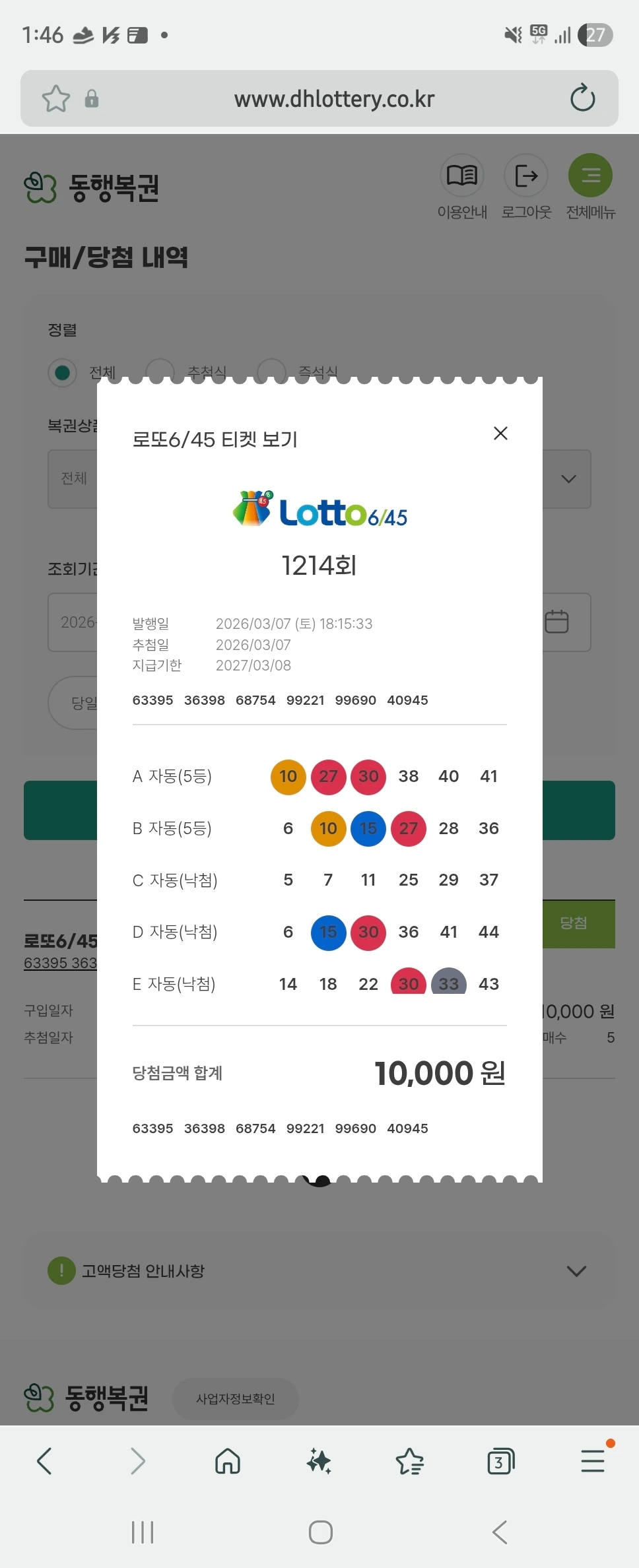 하지만 나중에 다시 확인해 보니 웬걸, 5등 두 개가 나란히 당첨되어 있었다. 1등의 거창함은 아니어도, 오늘 내가 부산에서 마주한 행운들이 결코 허상이 아니었음을 증명하는 아주 귀여운 '물적 증거'였다.