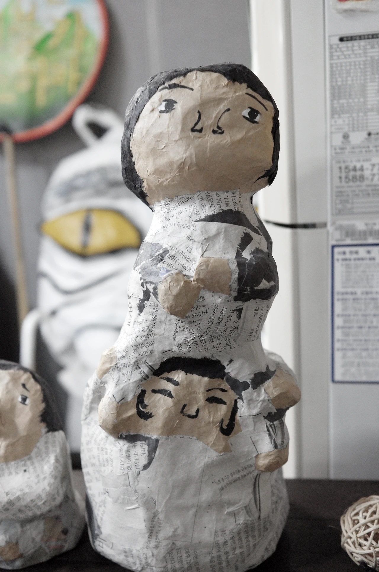 결혼하고 한 6개월, 축의금 받은 걸로 둘이 팽팽 놀다가 같이할 수 있는 일을 찾다보니 아파트 알뜰장에서 꽈배기를 팔면 좋겠다 싶더라구요. 일주일 동안 열심히 연습해서 꽈배기 장사를 한 3, 4개월 했어요. 그런데 일이 너무 고된 게, 아침에 장사할 것 다 펼쳤다가, 저녁에 다시 철수하고 설거지하고, 그러다 새벽에 잠드는데 몇 시간 못 자고 다시 일어나서 반죽 만들고, 아파트 찾아가서 펼치고 장사하고 다시 철수하고... 차라리 가게를 차리자고 했죠. 가게 자리 계약하고, 청소도 하고 열심히 오픈 준비를 하는데, 임신 사실을 알게 된 거예요. 그래서 그것도 접고, 결국 남편은 취직해서 일을 하고, 그러다 아이가 태어났어요. 아이가 세 살쯤 됐을 때 일을 찾고 있는데, 후배가 인형극 한다는 소식을 듣고는 귀가 번쩍 뜨이더라구요. 인형극을 하면 내가 하던 연극 경력도 살리고, 아이도 키울 수 있겠다 싶더라구요. 남편이 타고난 손재주도 있어서 석 달 동안 후배가 있던 서울의 극단으로 출퇴근하면서 인형 제작을 배웠어요. 감사하게도 그 극단 대표님이 받아주셔서 기회가 됐죠. 그리고 공연 제작의 프로세스는 내가 알고 있으니까 곧 극단 창단을 했어요. 또 감사하게도 기존에 내가 있던 극단의 대표님께서 허락해주신 덕분에 극단의 뮤지컬 작품을 인형극으로 각색해 큰 어려움 없이 <황소탈>이라는 첫 작품을 만들 수 있게 됐어요. 마치 모두가 우리를 응원하는 듯한 기분에 패기만만하게 공을 들이며 열심히 만들었죠. 근데 첫 공연에 바리바리 싸 들고 가서 벌벌 떨었어요. 과연 우리가 할 수 있을까?