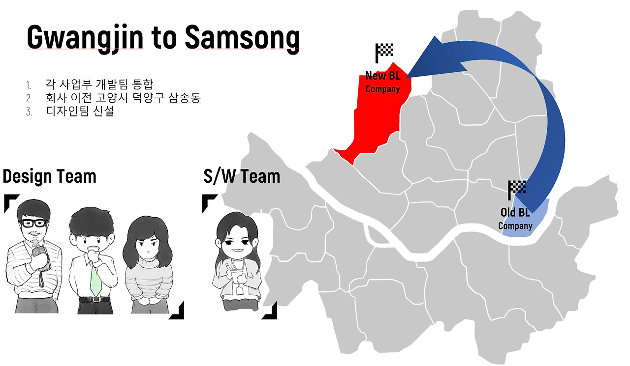 디자인팀은 해체되고 지 사원은 소프트웨어로 오쌤과 용과장은 하드웨어 팀으로 흡수되었다.