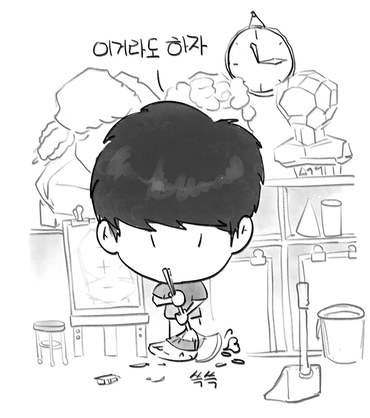 지우개 가루를 쓸고, 이젤을 정리하고,