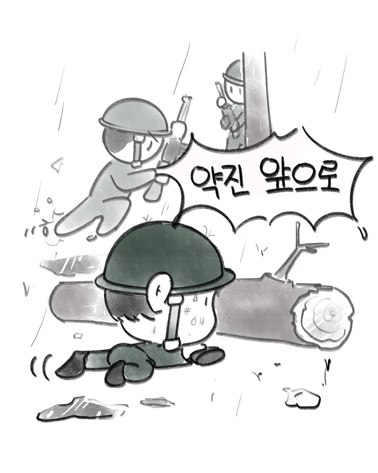 호령과 함께 소총을 들고 달렸다. 낮은 포복, 높은 포복, 응용 포복. 온몸이 흙탕물에 젖고 입 안엔 모래가 씹혔다.