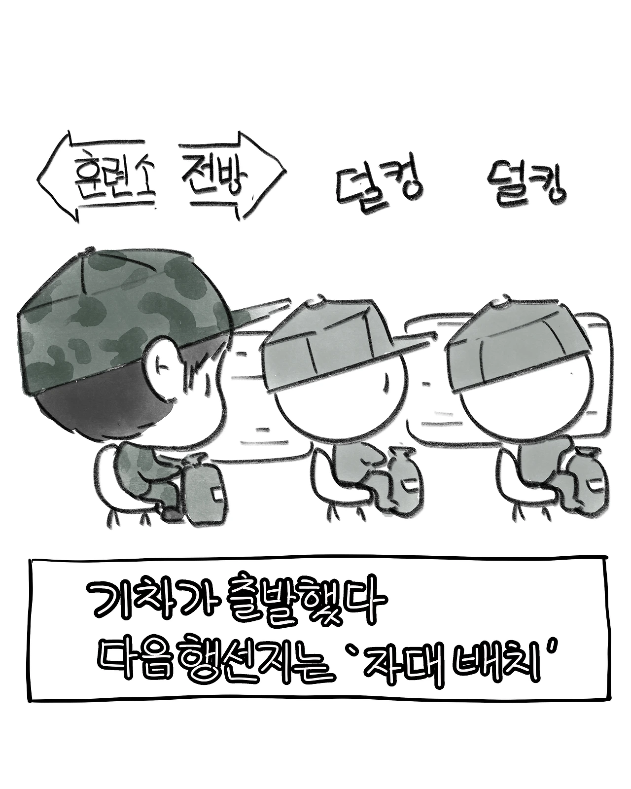기차가 출발했다. 다음 행선지는 ‘자대 배치’. 모두의 얼굴엔 긴장과 설렘이 섞여 있었다.