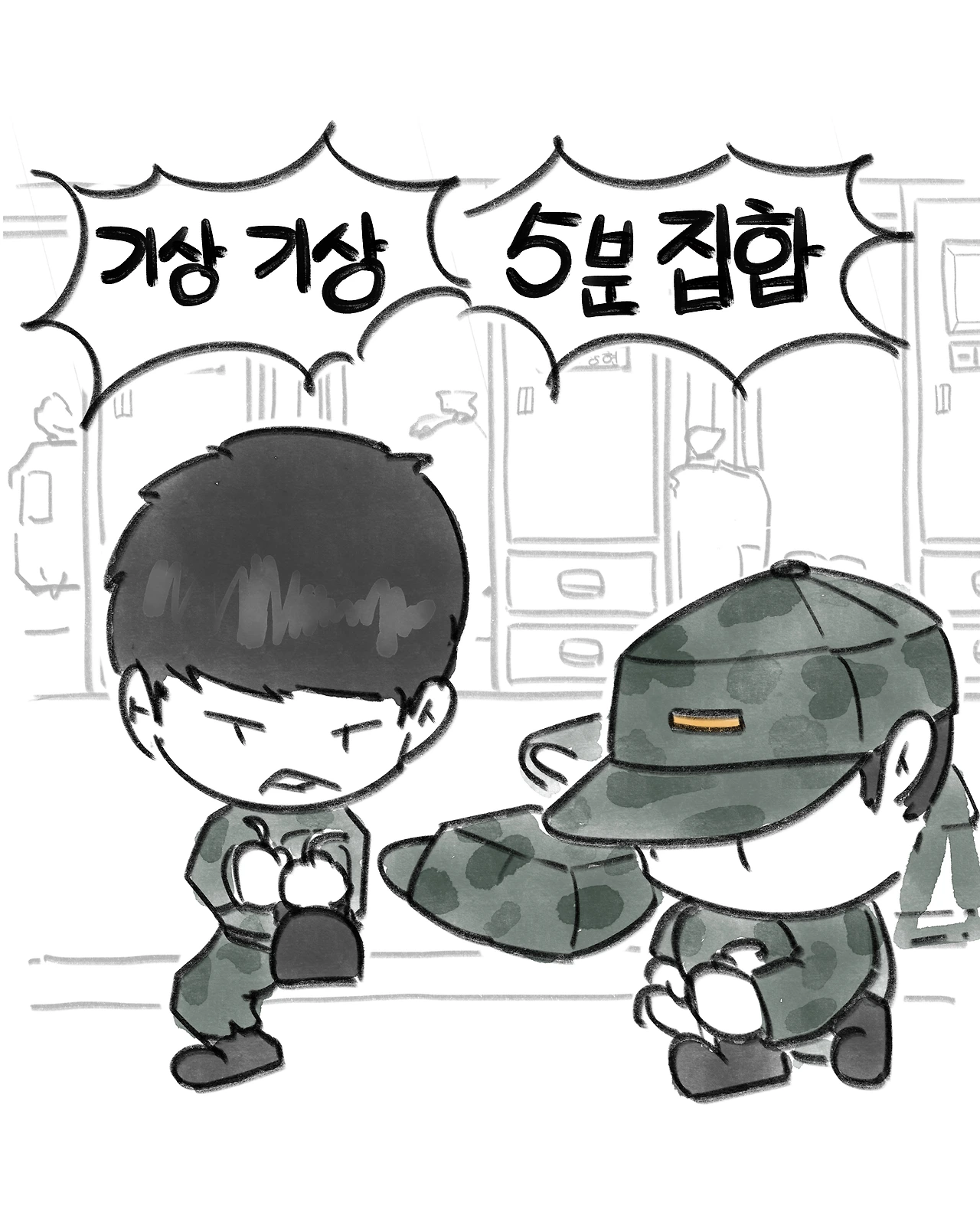 “기상!! 기상!! 부대 전원 전투복으로 환복 후 연병장 5분 내 집합!!!”