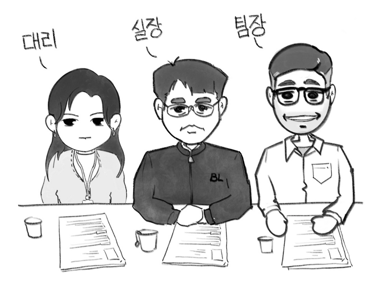 면접장엔 상품기획실 실장, 디자인팀장, 그리고 시각 디자인 파트 도대리.