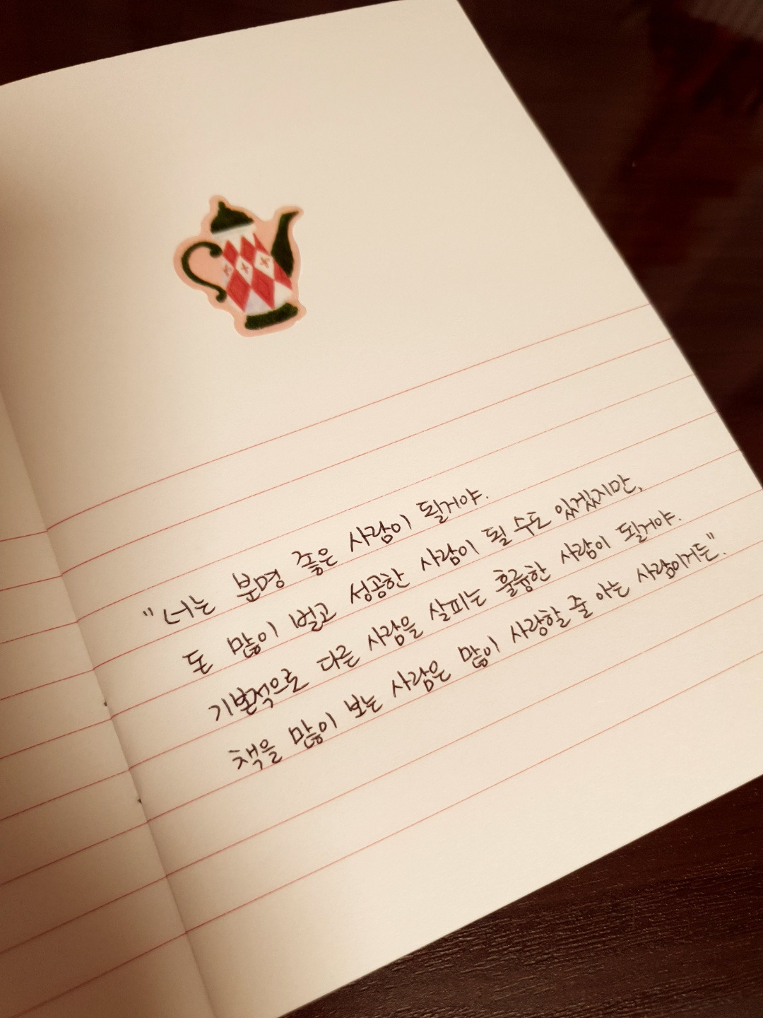 “너는 분명 좋은 사람이 될 거야. 돈 많이 벌고 성공한 사람이 될 수도 있겠지만, 기본적으로 다른 사람을 살피는 훌륭한 사람이 될 거야. 책을 많이 보는 사람은 많이 사랑할 줄 아는 사람이거든.”