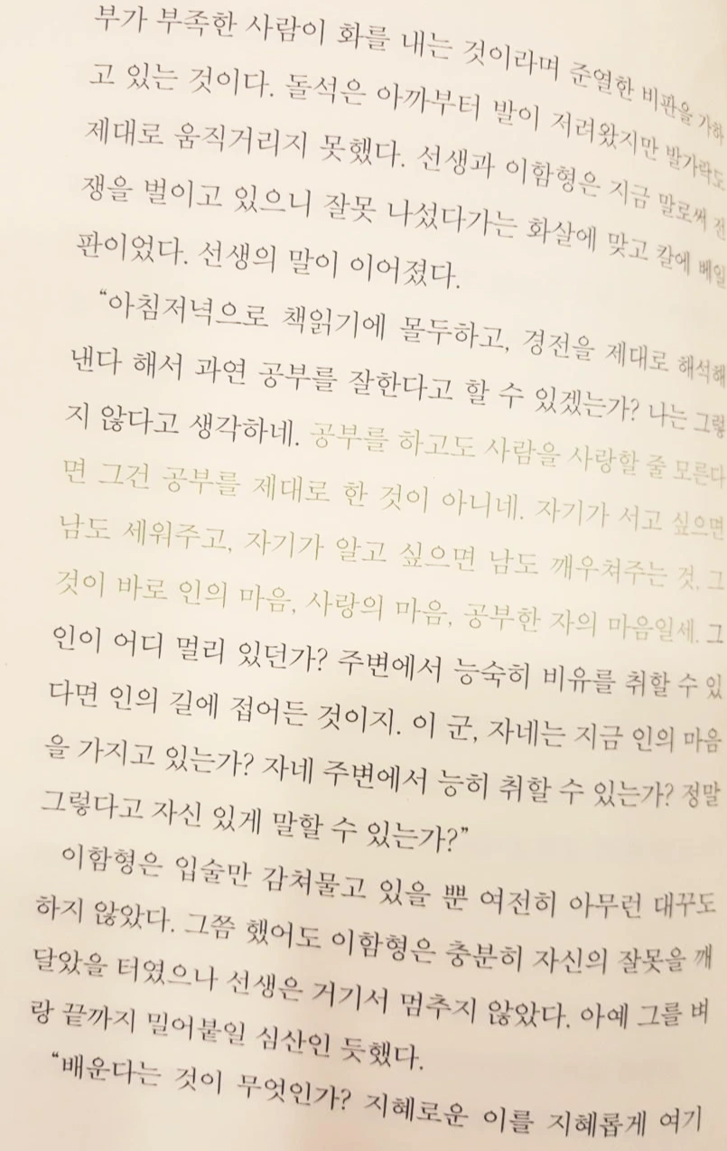 "공부를 하고도 사람을 사랑할 줄 모른다면 그건 공부를 제대로 한 것이 아니네. 자기가 서고 싶으면 남도 세워주고, 자기가 알고 싶으면 남도 깨우쳐주는 것. 그것이 바로 인의 마음, 사랑의 마음, 공부한 자의 마음일세."