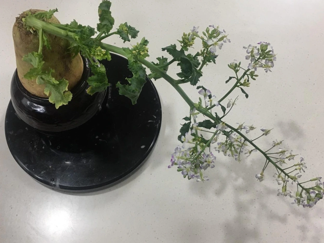 그에 대한 작은 보답이라도 하려고 거실 테이블 중앙에 항아리 화병에 물을 넣고 무를 꽂았다.