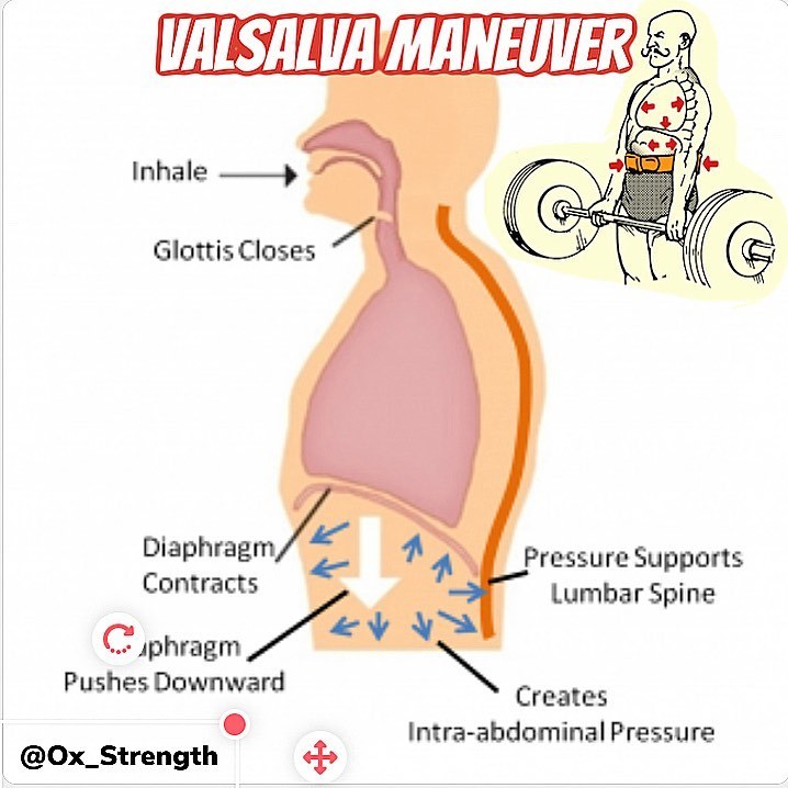 4. 발살바 호흡법은 두 가지로 나뉩니다. 완전한 발살바 호흡법은 최대 5회 미만 중량 시 사용합니다. (리프팅 벨트도 최대 5회 미만부터 착용) 동작의 시작점에서 끝나는 지점까지 숨을 멈추고 복압을 유지하며 동작을 진행합니다. 완전히 동작이 끝난 후에 호흡을 내쉽니다. 부분 발살바 호흡법은 시작의 3분의 1 지점에서 숨을 참고 끝나는 3분의 1 지점에서 호흡을 내쉽니다. 역도선수의 경우 인상, 용상 동작 시 완전한 발살바 호흡법을 사용합니다. 스쿼트나 데드리프트 같이 보조 운동은 부분 발살바를 이용해 호흡합니다.