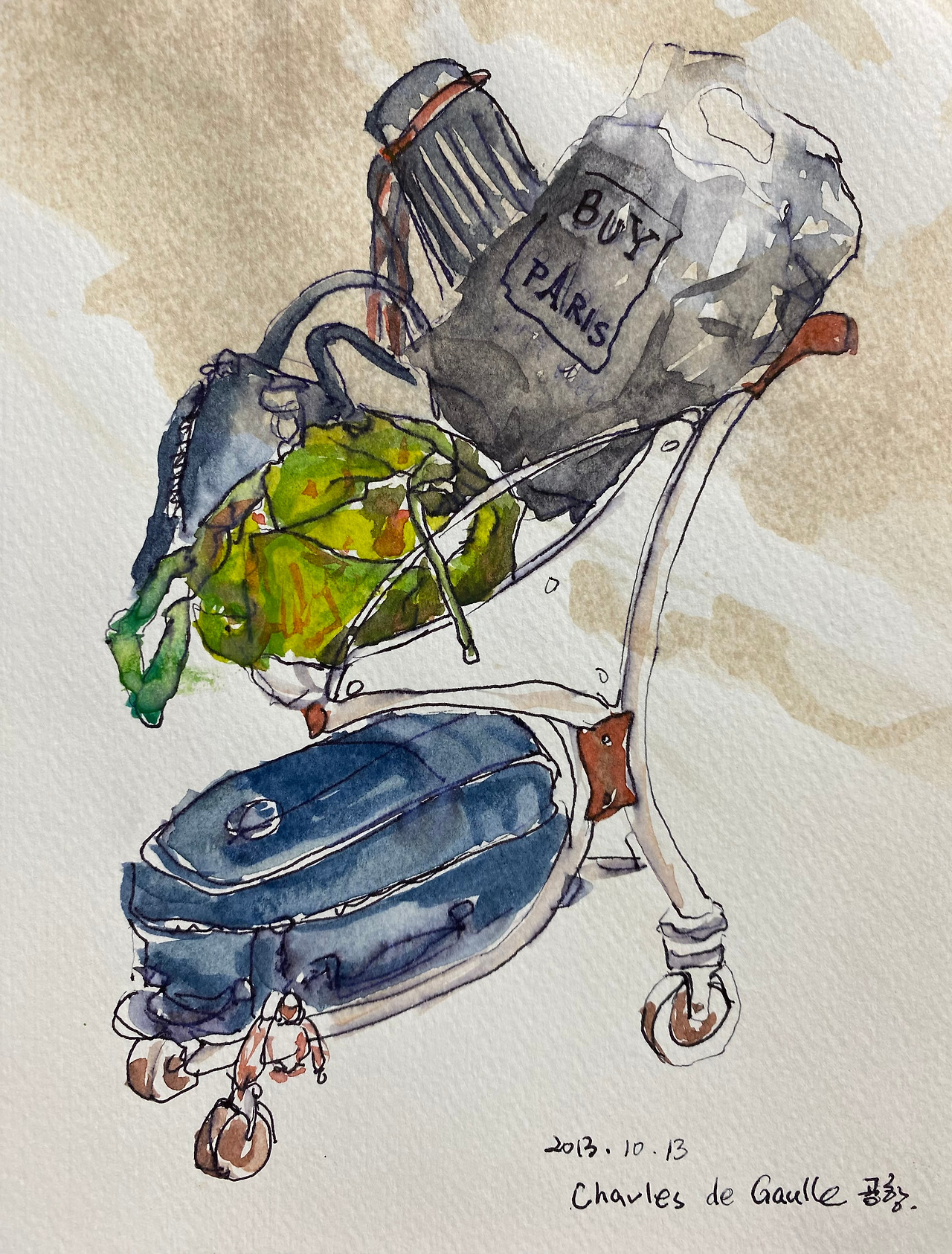 땀을 한 바가지 쏟아가며 어찌어찌 짐을 챙겨서 앉아 한숨 돌리는 중에 카트에 눈이 갔다. 가만 보니 '짐의 형태가 저리 가지각색이니 고생했구나' 싶었다. 진이 빠진 내 꼴이 한심하고 우스워서 짐을 실은 카트를 그림에 담았다.