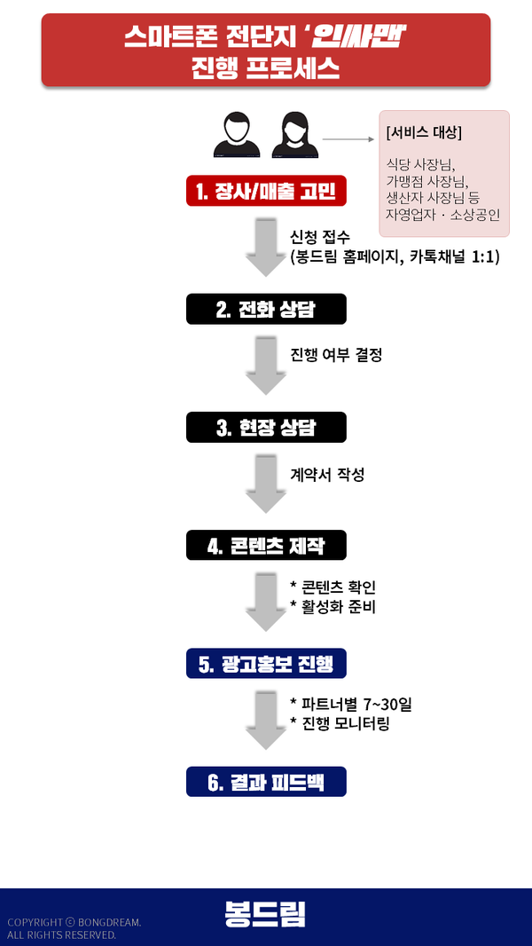 봉드림에서 제작한 광고 콘텐츠를 공유받고 충분하게 이해한 다음 사전에 논의된 일정대로 지역 내에서 우리 매장/제품의 광고가 진행됩니다.