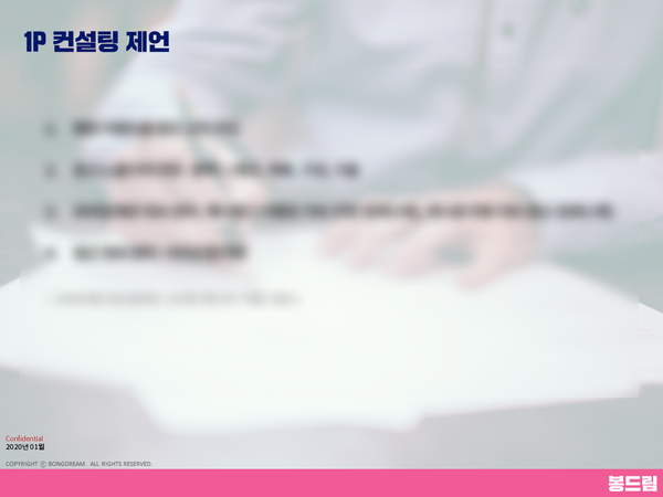 봉드림에서는 한 달 쿼터를 정해놓고 순서대로 진행 중에 있기 때문에 콘텐츠 기획, 카피라이팅, 디자인 진행, 버전 업데이트 등의 과정이 보통은 7일~10일 정도 소요됩니다.
