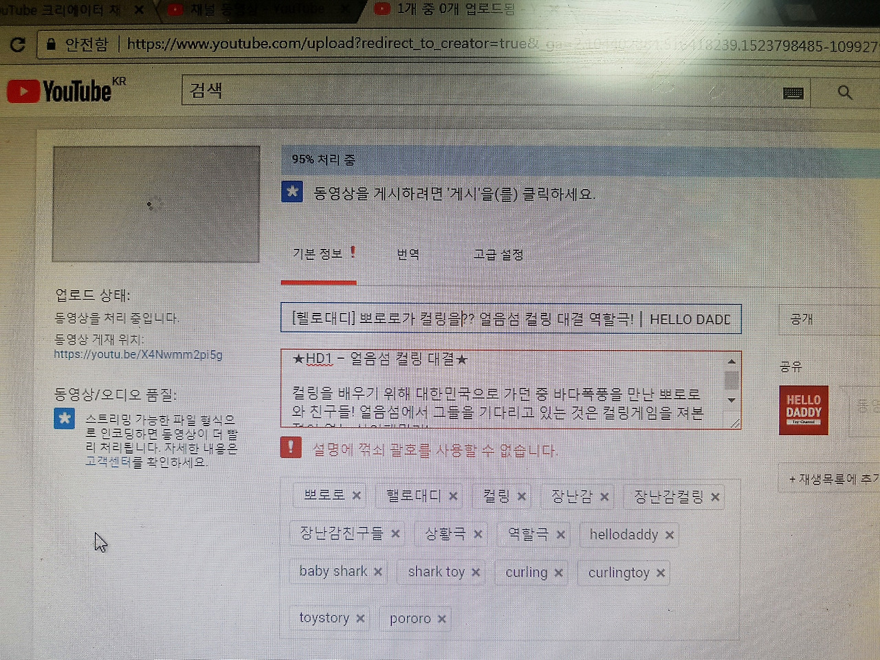첫 영상이 업로드되는 화면 캡처. 정말 엄청나게 말로 할 수 없을 만큼 벅찬 감정 그 자체였다.