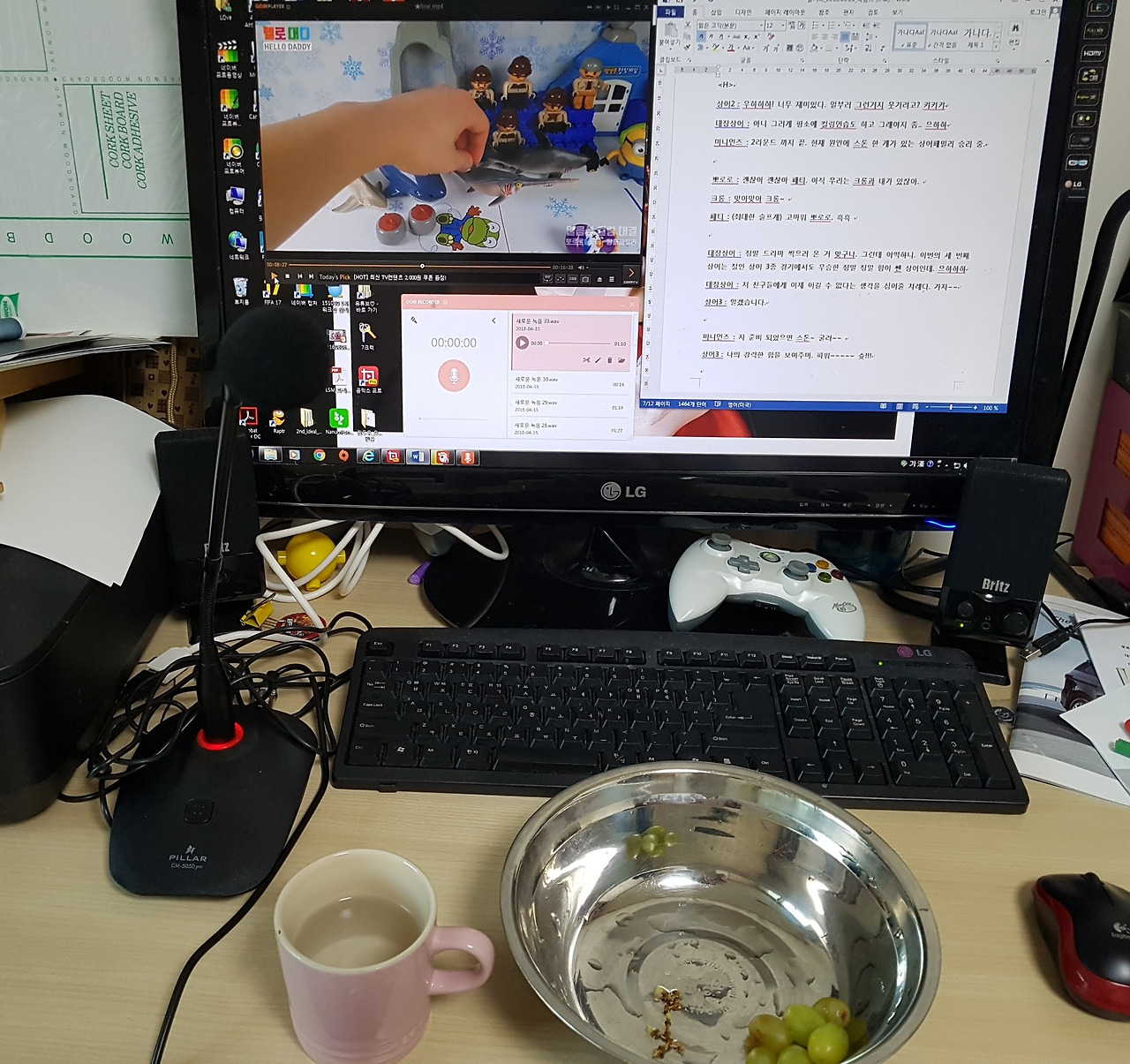 모니터에 나오는 가편집 영상 흐름에 맞춰 마이크로 모든 배우(?)들의 목소리를 내며 녹음하던 순간은 평소에 아들과 역할극 놀이를 하며 목소리를 바꾸던 때와 많이 달랐다.