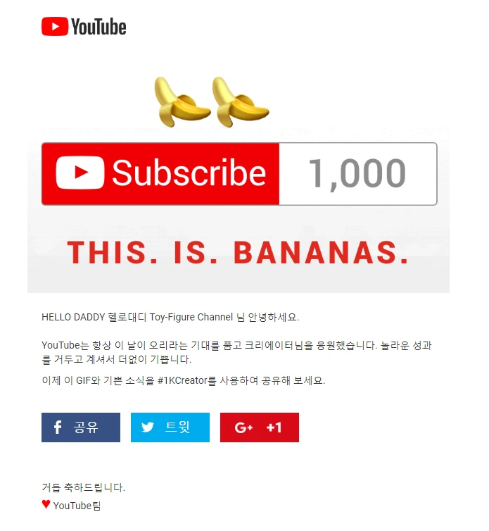 구독자 1,000명 기념 유튜브팀의 축하 메일. 1,000의 숫자가 전부가 아님을 알게 된 정말 감격스러운 순간이다.