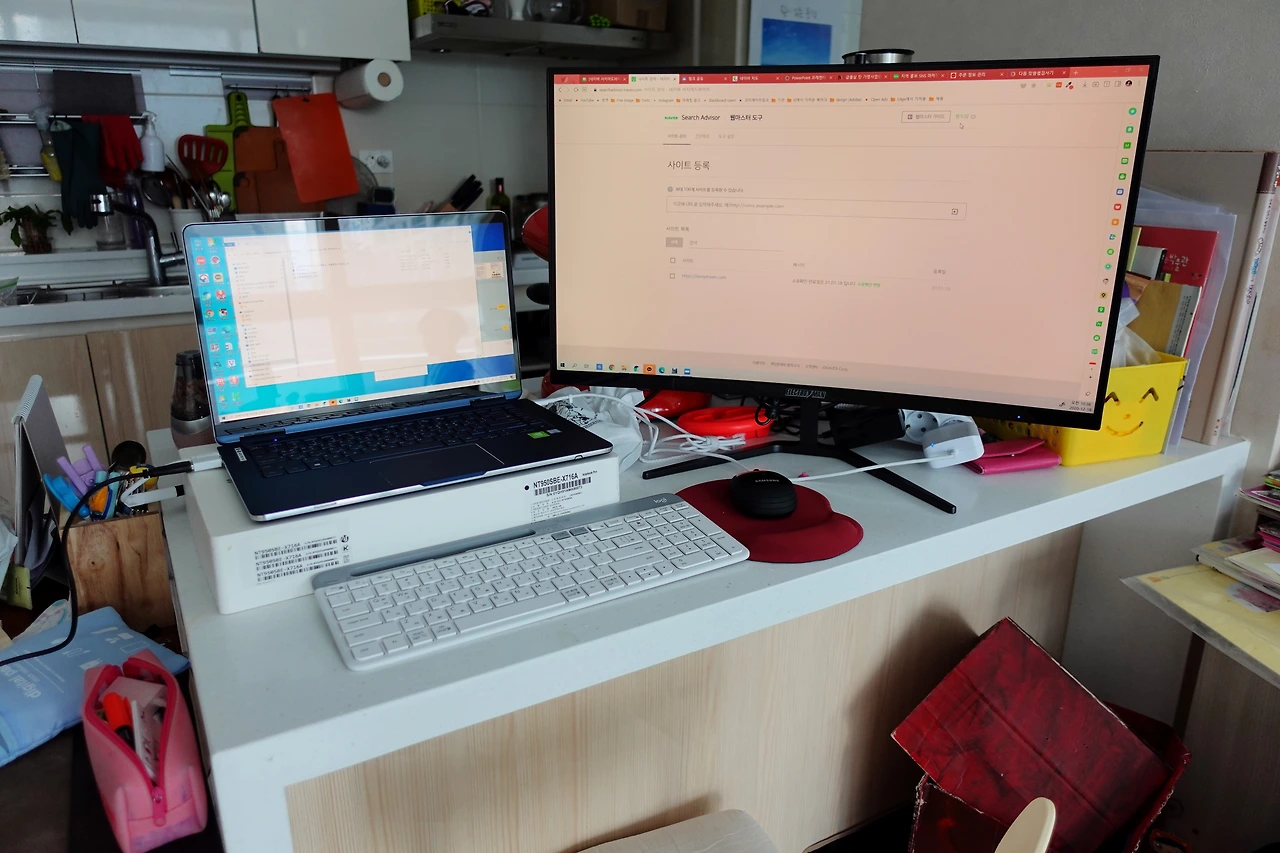 거리두기 강화와 함께 일렉 OO마트에서 저렴하게 구입해서 유용하게 쓰고 있는 듀얼 모니터.