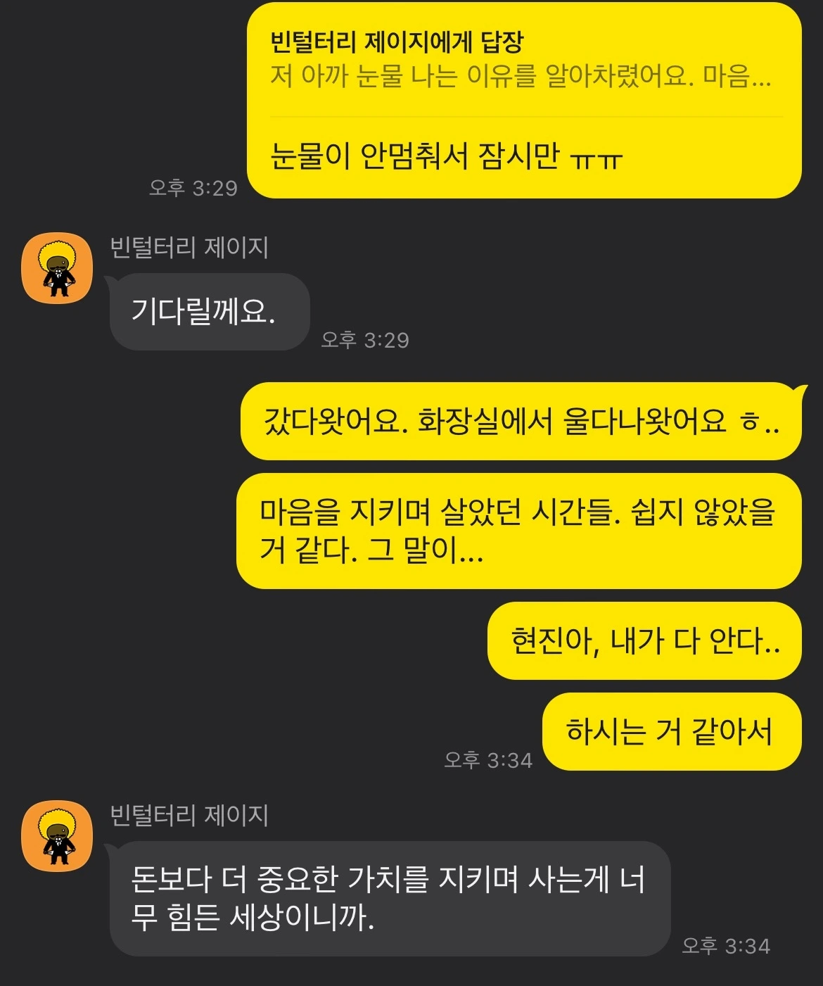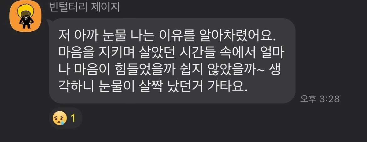 오늘의 명장면은 이거예요. 카카오톡 대화하다가 눈물이 주체할 수 없이 나서, 화장실로 올라가서 칸 안에서 울다 나온 거요. 숨죽여 우는데, ‘나 지금 왜 우나’ 이 생각이 지나갔어요. 하나님이 내 마음을 다 아신다고 그 순간 같이 계신 것 같았어요. ‘현진아, 내가 다 안다.‘ … 저는 그 음성이면 다 되거든요. 월 100 만원도 안 되는 월급을 받았던 사무치게 외로운 사무간사 시절에도 ‘현진아, 내가 안다. 내가 너의 선택을 기뻐한다.‘라고 말씀하신 하나님 때문에요. ’그럼 저 힘내서 더 살 수 있어요!‘ 그런 마음으로 일상으로 돌아갔거든요