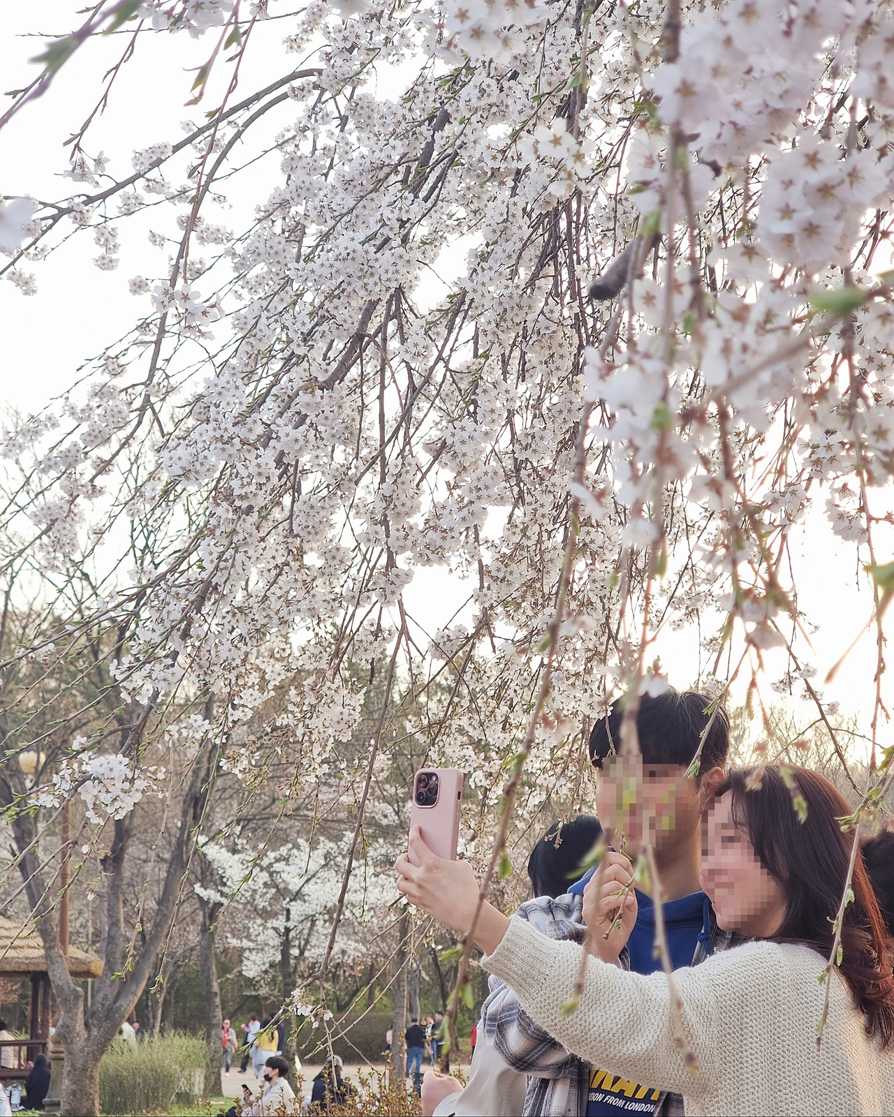 다섯 잎의 끝이 하트 모양인 벚꽃잎을 하나하나 관찰하고, 사방을 둘러보며 벚꽃을 사진에 담을수록 외로움은 더해갔다. 연인들이 서로 바라보는 눈빛과 아이를 바라보는 엄마 아빠의 눈빛은 아름답게 닮아 있었다. 연인들은 벚꽃을 얼굴 가까이 묻고, 사이사이로 싱그런 미소가 새어 나온다. DSLR 카메라로 몽환적인 분위기를 연출해 본다. 늘어진 벚꽃을 앞쪽에 두고 연인들이 위치한 중간지점에 포커스를 맞춘다. 배경도 흐리게 하여 오직 연인에게만 시선을 모았다. 능수벚꽃은 연인의 핑크빛 볼과 볼 사이로 흘러내렸다.