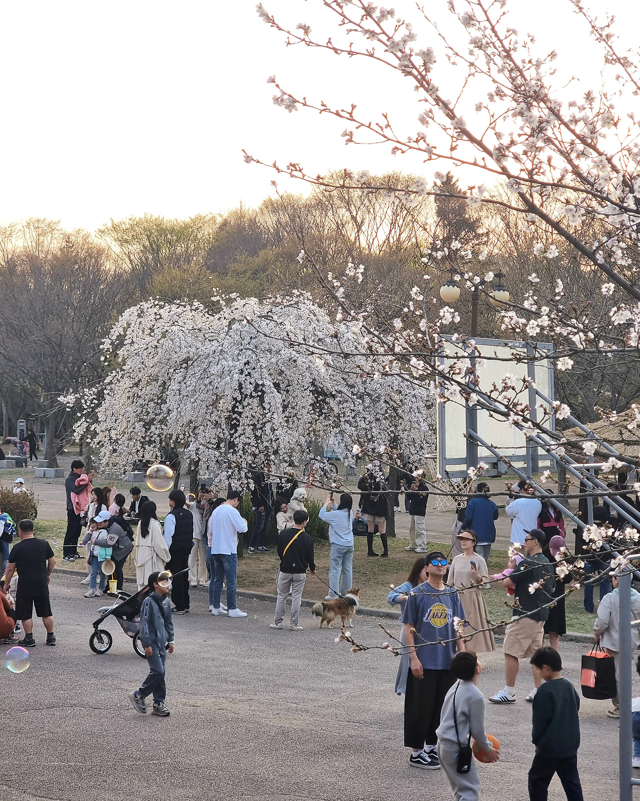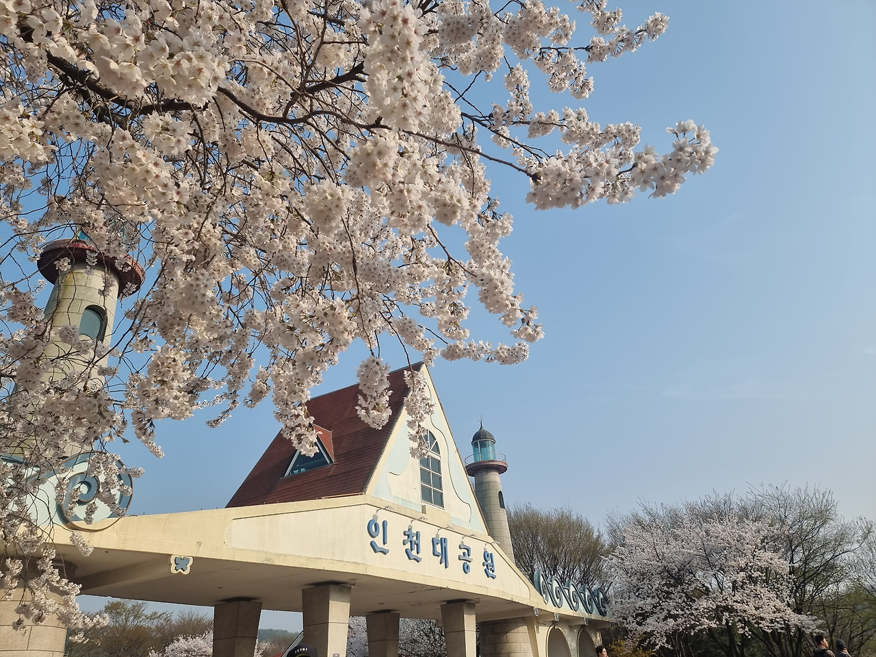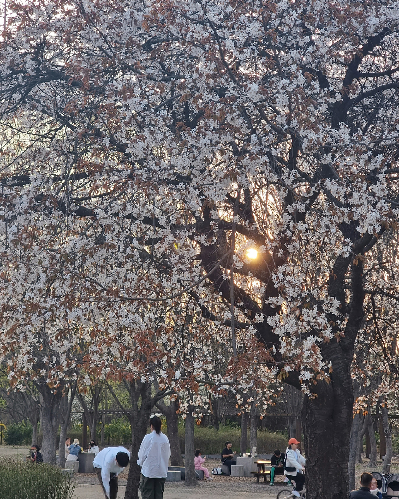 하얀 셔츠를 입은 한 쌍의 젊은 친구가 능수벚꽃 나무 그늘에 자리를 잡는다. 라탄바구니(등나무바구니)를 열자 간단하게 먹을 간식거리가 보인다. 서로에게 먹여주기까지 한다. ‘저거 내가 받아먹고 싶다. 눈을 꼭 감고 입을 벌려볼까!’ 두 손으로 입을 가리고 피식 웃음이 나온다. 4월 중순이지만 밤이 되면 제법 쌀쌀하다. 벚꽃 축제를 보려면 밤까지 있어야 할 텐데 셔츠 하나로 버틸 수 있을까! 엄마 같은 마음으로 걱정도 해본다. ‘내가 포근한 담요가 되어 줄게!’ 날이 점점 어둑어둑해져 집을 향할 무렵, 인천대공원 정문에서 한 젊은 여학생이 택시에서 내린다. 아뿔싸! 완전 한여름 복장이 아닌가! ‘아가야, 감기 들겠다!’ 나도 마음은 청춘이지만 벚꽃 축제를 뒤로 하고 다시 밥 하러 들어가야만 했다.