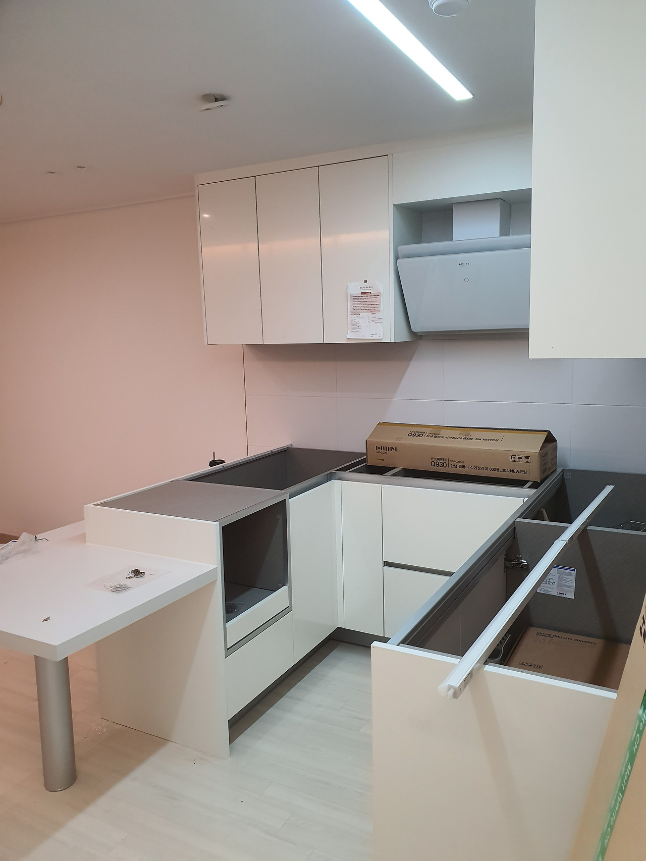 한샘 매트화이트 붙박이장, 파우더장, 부엌 시공 중