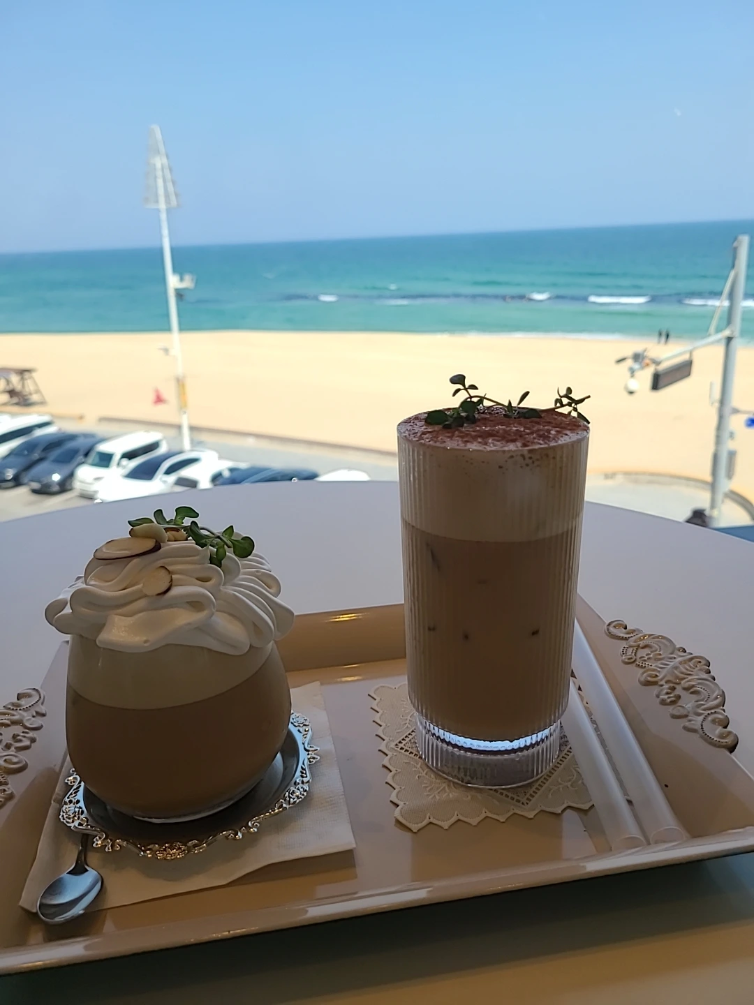 듣던 대로 해변을 따라 각종 카페가 쭉 들어서있는 광경이 장관이었다. 카페 대부분이 바다를 바라보고 있어 어느 곳을 들어가도 환상적인 푸른 바다뷰를 즐길 수 있는 것도 장점이다. 무려 동해바다를 품은 카페라니! 커피맛도 저절로 좋아질 것 같은 기대를 안고 미리 검색해 두었던 카페 한 곳으로 들어갔다.