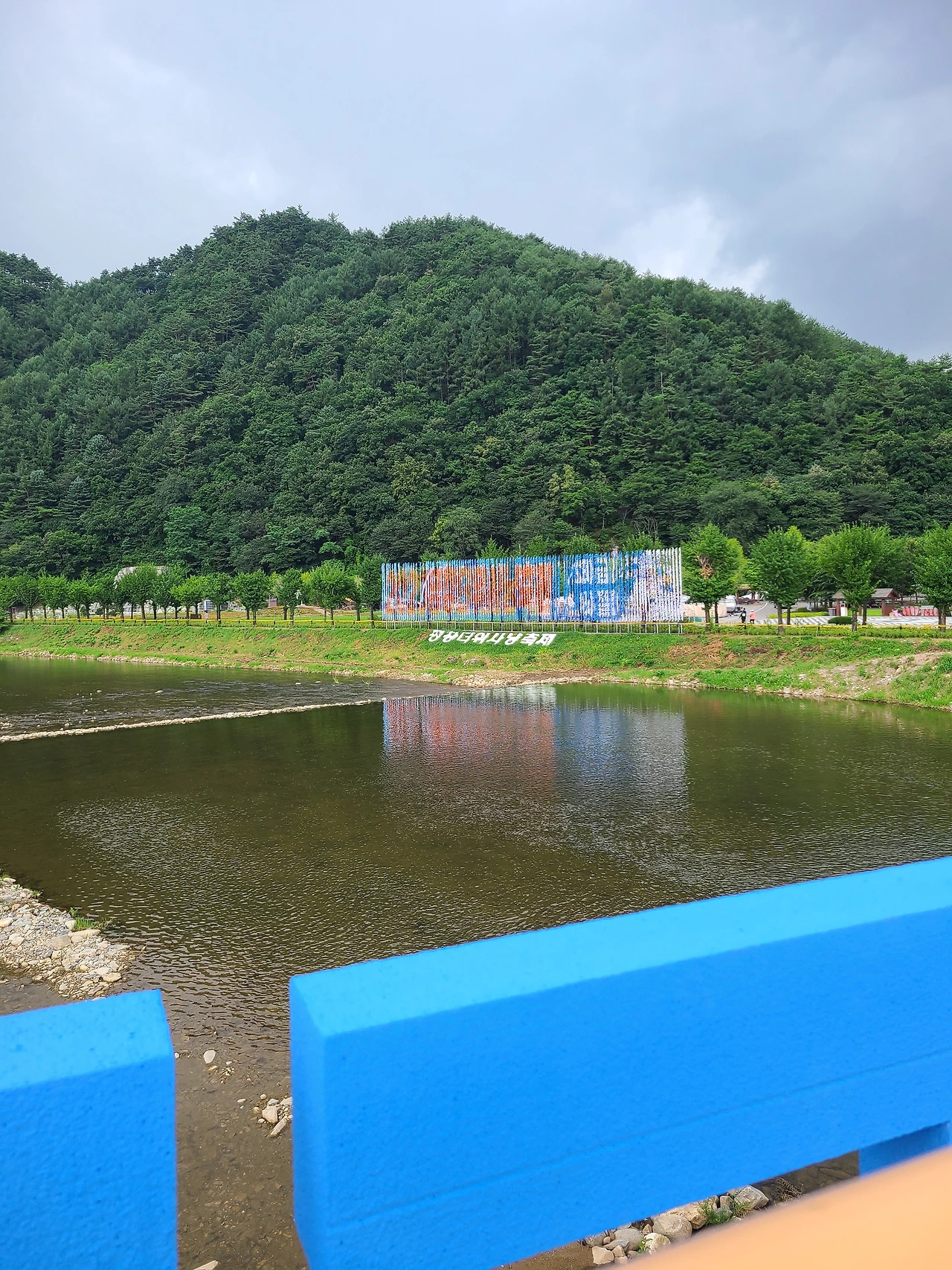 지역의 이름 있는 축제답게 형형색색의 풍선과 플래카드가 이곳이 바로 축제장임을 온몸으로 말하고 있었다. 곳곳에 배치된 안전요원의 안내에 따라 축제장으로 걸어갔다. 하필 가장 멀리 떨어진 주차장이라 몇백미터는 족히 걸어야 했다. 중간에 계곡 다리를 따라 건너는 순간, 갑자기 천둥소리가 나더니 비가 후드득후드득 떨어지기 시작했다.