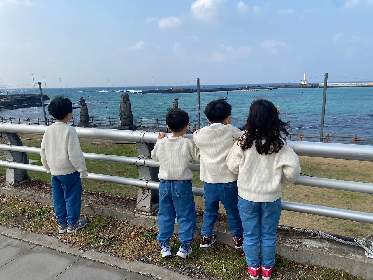 개인적으로 감사한 것은 제주도 해안가에 멋진 뷰를 자랑하는 근사한 감성카페들이 굉장히 많이 들어서 있다는 사실이다. 바람을 느끼며 거니는 해변가도 좋았지만 카페 통창 너머로 품은 그림 같은 바다에 한동안 말없이 따뜻한 한라봉차를 마시기도 했다. 천상(?) 도시여자의 체력관리법 중 하나라고 해두자. 물론 아이들은 추운지 모르고 해안가에서 놀았다.