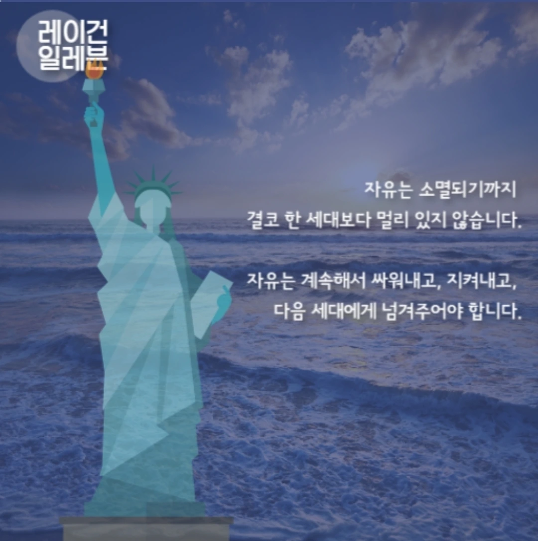 공산주의가 또 하나의 슬프고 기이한 인류 역사의 한 챕터를 장식하며 그 마지막 페이지를 쓰고 있다고 믿습니다. 이렇게 믿는 이유는 인간 자유를 추구하는 힘의 원천이 물질적인 것이 아니라 영적인 것이기 때문입니다. 그것은 한계가 없기 때문에, 동료 인간들을 노예로 삼고 있는 그들을 거부하게 하고 결국 이길 것입니다. 이사야의 말처럼, "피곤한 자에게는 능력을 주시며 무능한 자에게는 힘을 더하시리니... 오직 여호와를 앙망하는 자는 새 힘을 얻으리니 독수리가 날개 치며 올라감 같을 것이요, 달음박질하여도 곤비하지 아니하겠고 걸어가도 피곤하지 아니하리로다...