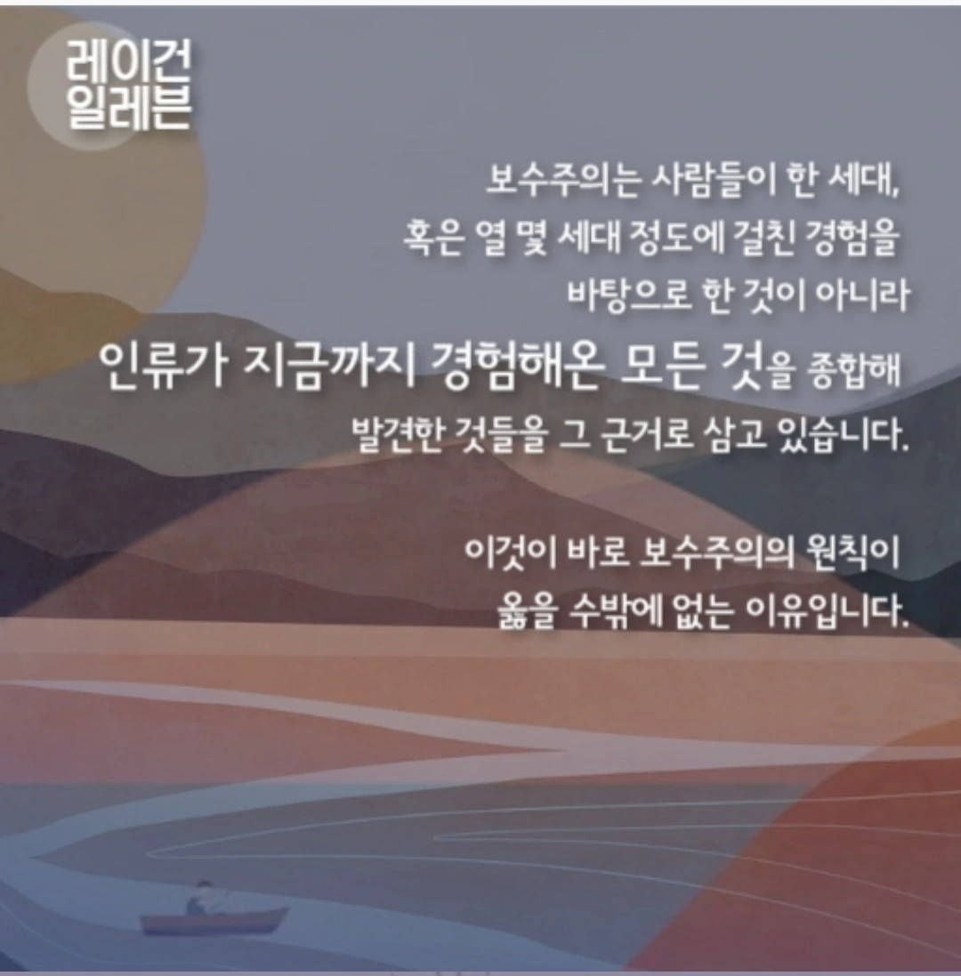 보수주의는 사람들이 한 세대, 혹은 열몇 세대 정도에 걸친 경험을 바탕으로 한 것이 아니라 인류가 지금까지 경험해 온 모든 것을 종합해 발견한 것들을 그 근거로 삼고 있습니다. 이것이 바로 보수주의의 원칙이 옳을 수밖에 없는 이유입니다.
