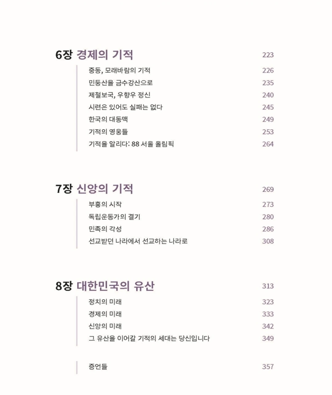 이 책은 대한민국의 세 가지 기적, 정치, 경제, 그리고 신앙의 기적을 다룬다.