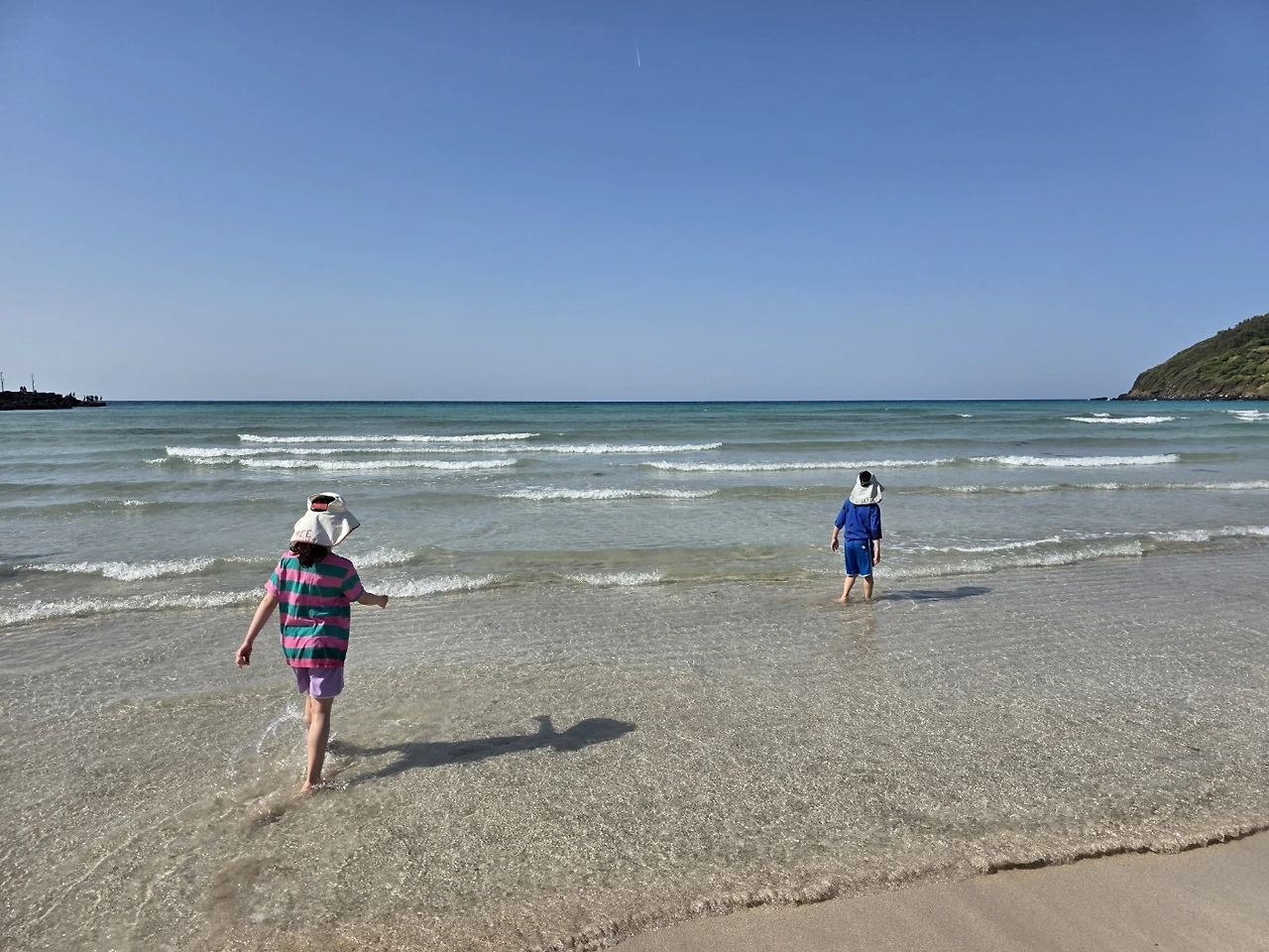 이튿날, 전날 내린 비 덕분인지, 아님 청정 제주에 있어서인지 시야가 확 트인다. 상쾌하고도 눈부신 햇살에 바다는 애매랄드빛으로 빛나고 아이들은 바닷가에서 한참을 놀았다. 바람도 불지 않고 햇살도 따뜻해서 바닷물이 시원하게까지 느껴졌다. 서울 촌놈인 우리 아이들은 속이 훤히 다 보이는 바닷물속을 살피고 거닐며 연신 해안가로 미역줄기를 찾아왔다. 이런 날은 온종일 수평선만 바라보며 모래사장을 거닐다 돌아가도 전혀 후회가 될 것 같지 않았다. 생각해 보면 그동안 우리의 제주도 일정은 늘 빠듯했다. 서울의 3배인 이 큰 섬을 시간단위로 쪼개고 쪼개어 관광지를 찍고 다니려면 별 수 없었겠지만 말이다. 이제 좀 느긋해지자. 아이들에게 제주도의 매력, 특히 자연과 바다의 매력을 만끽할 수 있을 기회를 충분히 주자. 여행은 도장 깨기가 아니므로.