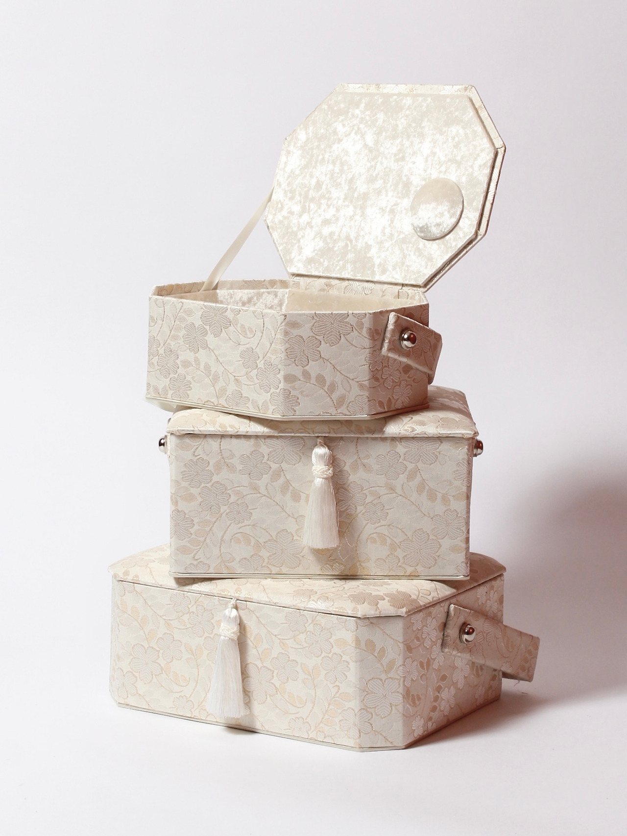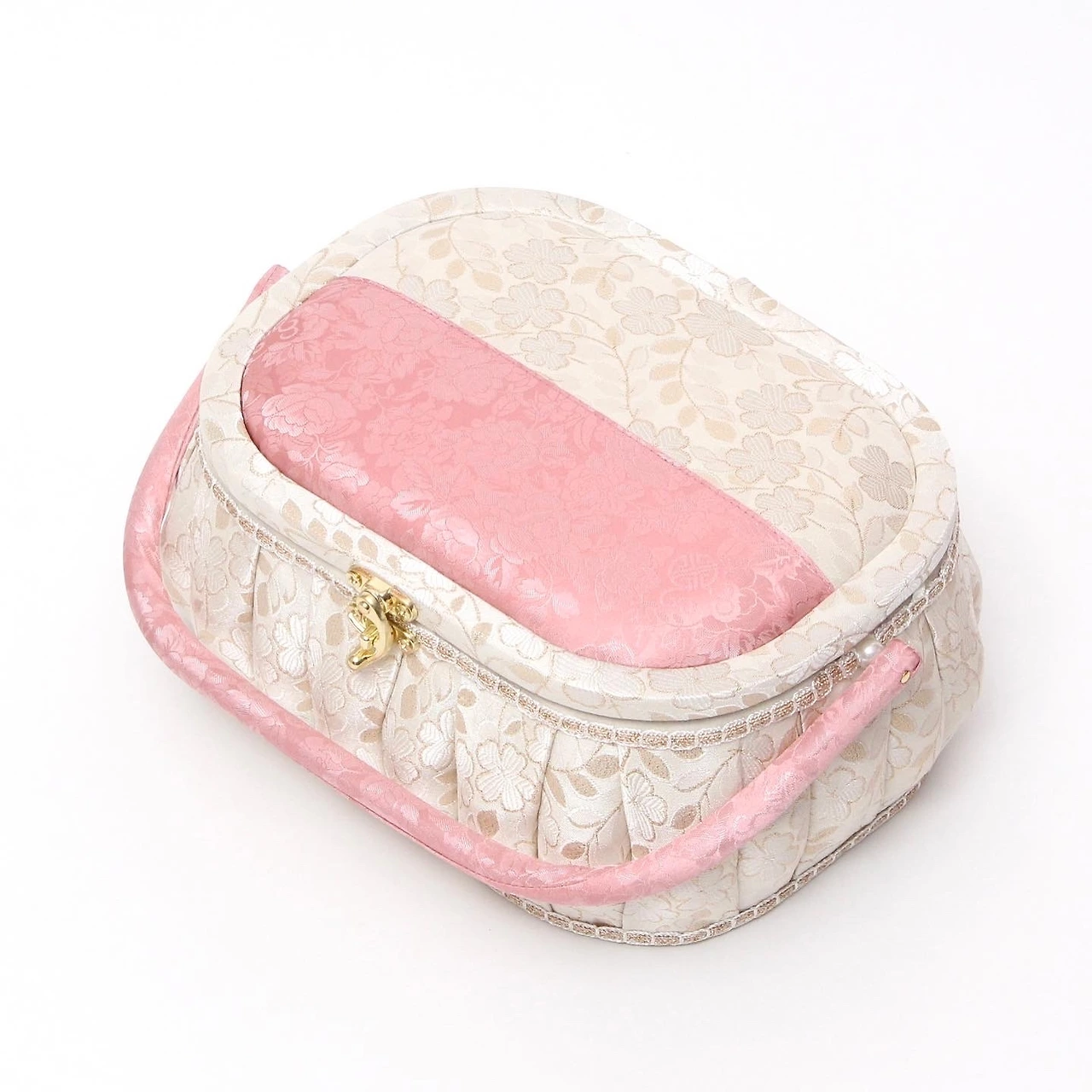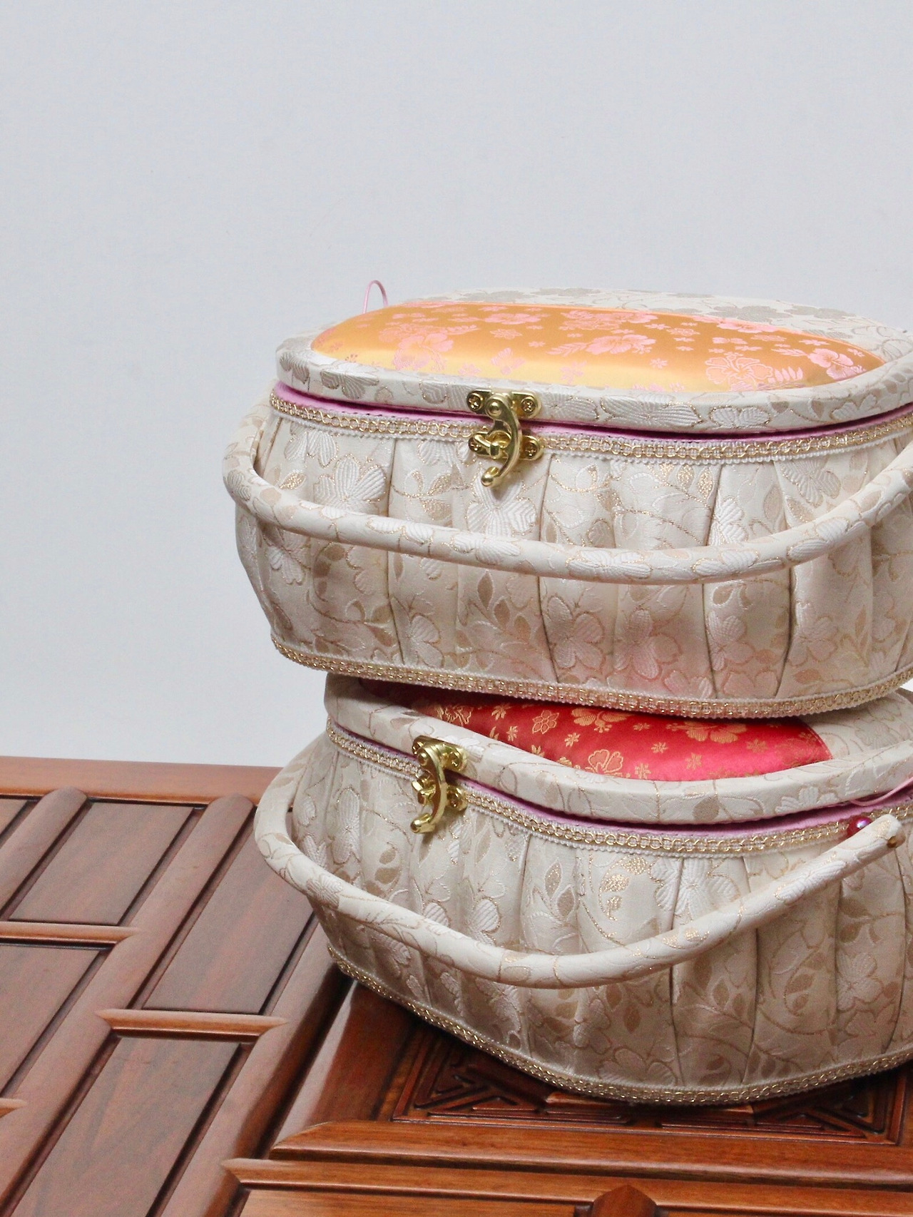 "코스모스"라고 불리는 ‘벚꽃’이 짜인 이 크림색 자카드 원단은, 마마리의 대표 원단이 되었다. 크림색 베이스다 보니 어떤 원단과도 잘 붙고 양단이던 공단이던, 다른 면 원단이던 대체로 잘 어울리는 편이다.