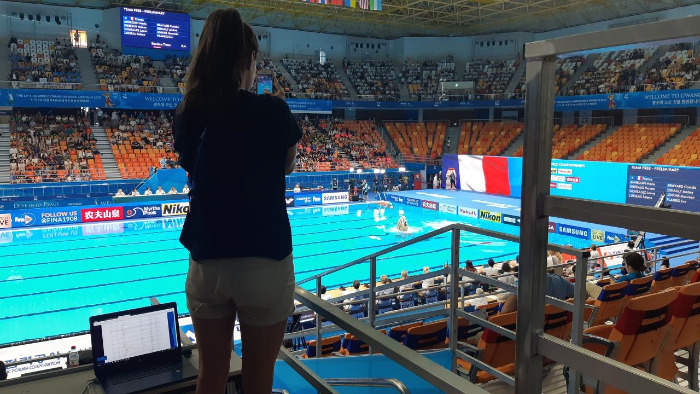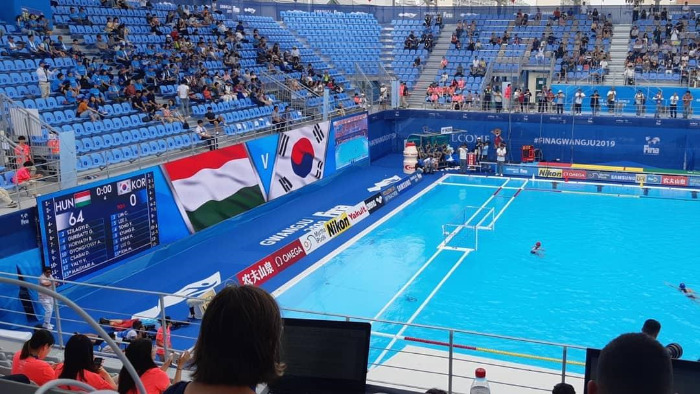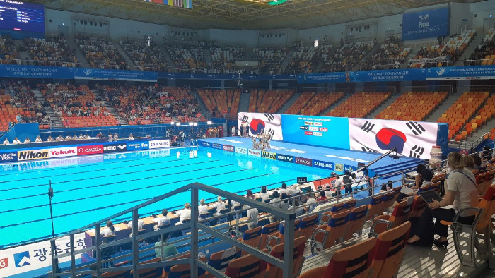 그러나, 그렇다 하여 이제와서, 광주에서 열리고 있는 세계수영선수권대회를 깎아내리고 싶은 건 아니다. 수영 종목의 매력에 대해 모르는 사람들이 많아서 그렇다고 생각하기 때문이다. 찰나의 예술 다이빙, 화려한 아티스틱수영, 물 속의 격투기 수구 등 ... 조금만 안다면 충분히 시간을 내서 즐기고 싶은 수영 종목들이 많다. 게다가 사상 처음 출전해 1골의 목표를 달성한 여자 수구대표팀, 깜짝 동메달을 목에 건 다이빙 김수지 등 의미있는 역사들이 쓰여지고 있는 현장이기도 하다. 물론 이 글에서 그 매력을 다 뽐낼 수 있을지 모르겠지만 현장에 다녀온 사람으로써, 경기장의 분위기를 몇 자 적어보려 한다.