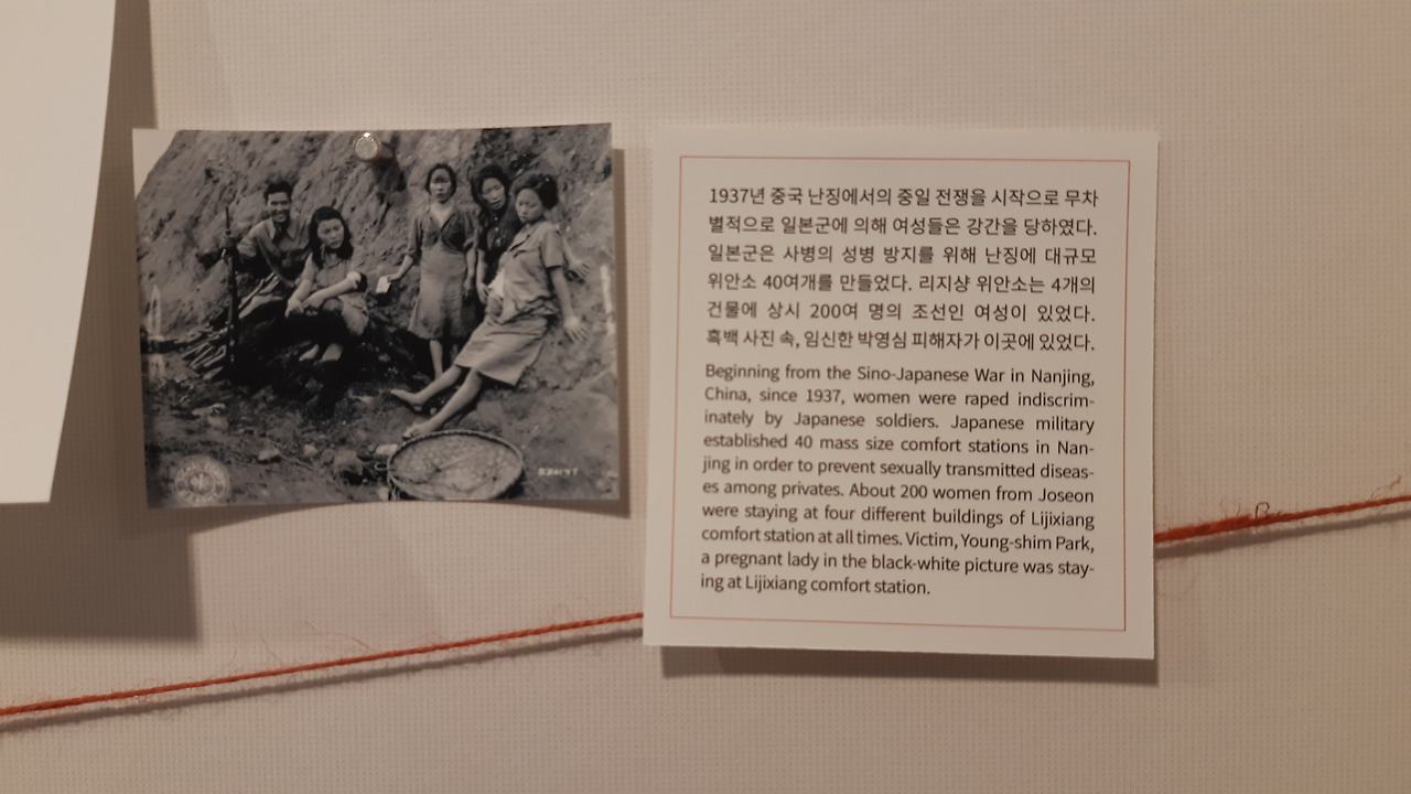 그런데 이 외에 소개할 사진들은 맥락이 좀 다르다. 특히 일본군들과 위안부 피해자들이 함께 소풍을 가서 찍었다는 단체 사진이 눈에 띈다. 잠깐, 소풍이라고? 그러고보니 어떤 사진들에서 일본군 위안부 피해자들은 예쁜 옷을 차려입고 독사진을 찍거나, 카메라를 편하게 응시하고 있다. 이수단 할머니를 한번, 소풍 나온 피해자들을 다시 한번, 보고 있자니 작가가 다가와 말을 걸었다. "어색해요?"