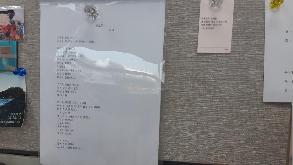 그 옆에 걸린 시와 문구는 할 말이 아주 많기도, 없기도 하다. 요약하면 사회인으로써의 다짐, 생각과 맥이 닿는 글들인데... 자세히 풀어내자면 또 새로운 문서 파일을 열어 하루 종일 써도 부족하다. 업무 스트레스나 인생에 대한 회의감을 토로하자면 (다들 하는 착각처럼) 끝도 없이 할 수 있을 것만 같으니까. 그래도 간단히 정리하면 이렇다.