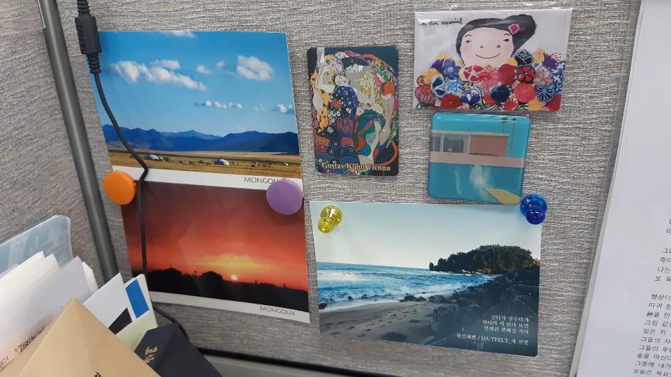 시선이 닿기 가장 편한 곳은 일명 ‘문화 세션’이다. 시각적으로 즐겁고 머리를 쉴 수 있도록 구성했는데, 아무래도 책상에 앉아 가장 많이 쳐다보는 부분이기 때문이다. 도사 전우치처럼 그림 속으로 들어갈 수 있다면 언제든 가고 싶은 곳들의 엽서가 있고, 또 아트 자석들도 붙어있다. 물론 익숙해진 만큼이나 색이 바래서 점점 쳐다보는 횟수가 줄었지만, 그래도 눈이 피로할 때 종종 쳐다보며 위안을 얻는다.