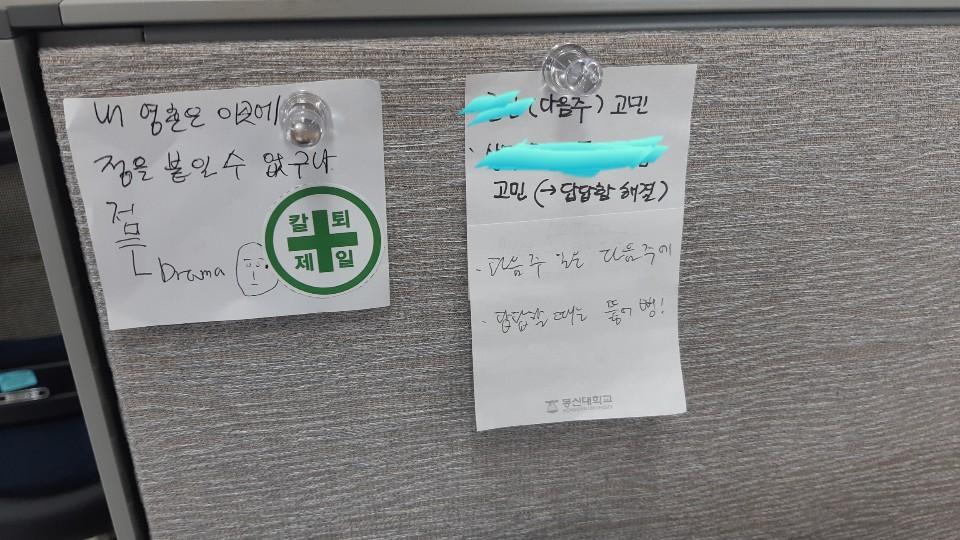 선배의 농담 세션에 붙어있는 쪽지들... 그리고 시간이 좀 더 지나자 그 위에 '칼퇴 제일' 스티커가 붙었다. 선배의 농담으로도 치유가 되지 않는 연차가 된 탓일까...
