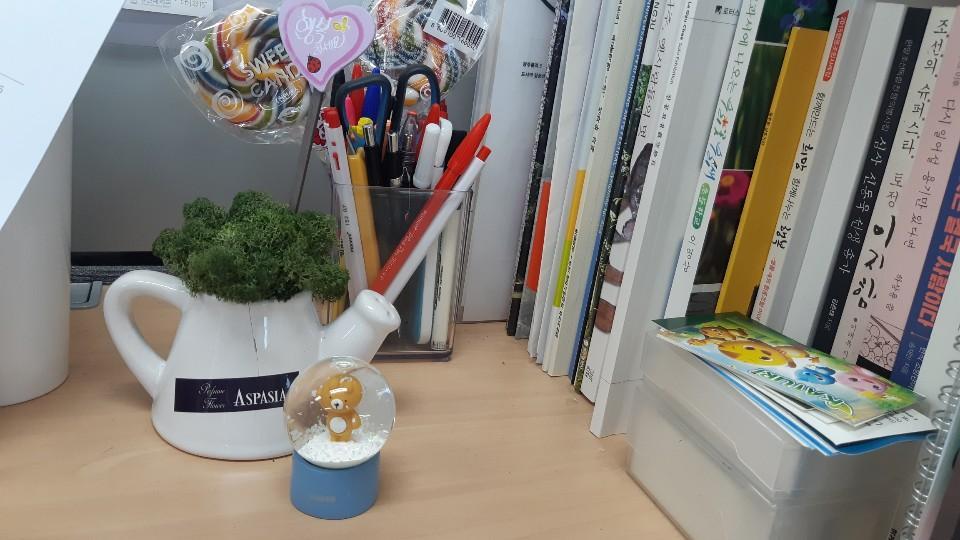 오른편엔 책장이 있다. 일하며 받은 자료와 책들, 그리고 선물로 받은 이끼 화분이 있다. 오랜 시간이 지났음에도 버리지 못하는 자료들에는 제작자의 고민과, 노력이 함축되어있는 것만 같다. 그래서 저 수많은 책들과 자료가 여러 ‘사람들’의 화신 같다고 느껴지기도 한다. 문제는 일을 하면서 계속 새로운 책들과 자료를 받고 있다는 건데.... 일하며 만나는 수많은 주장들 만큼이나 어지럽다.자료들이 너무 쌓여 내 '영역'을 침범하지 않도록, 냉정히 판단하고 덜어야겠다 생각한다.