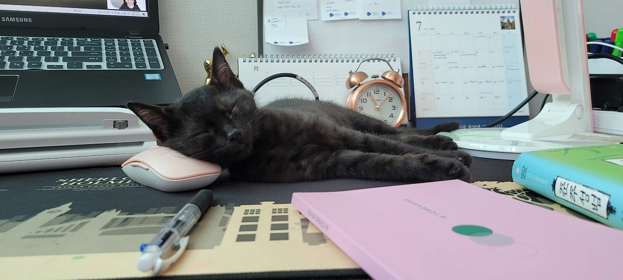 지금 아기 고양이 용이는 내 앞에서 온 몸을 길게 늘어뜨린 채 자고 있다.